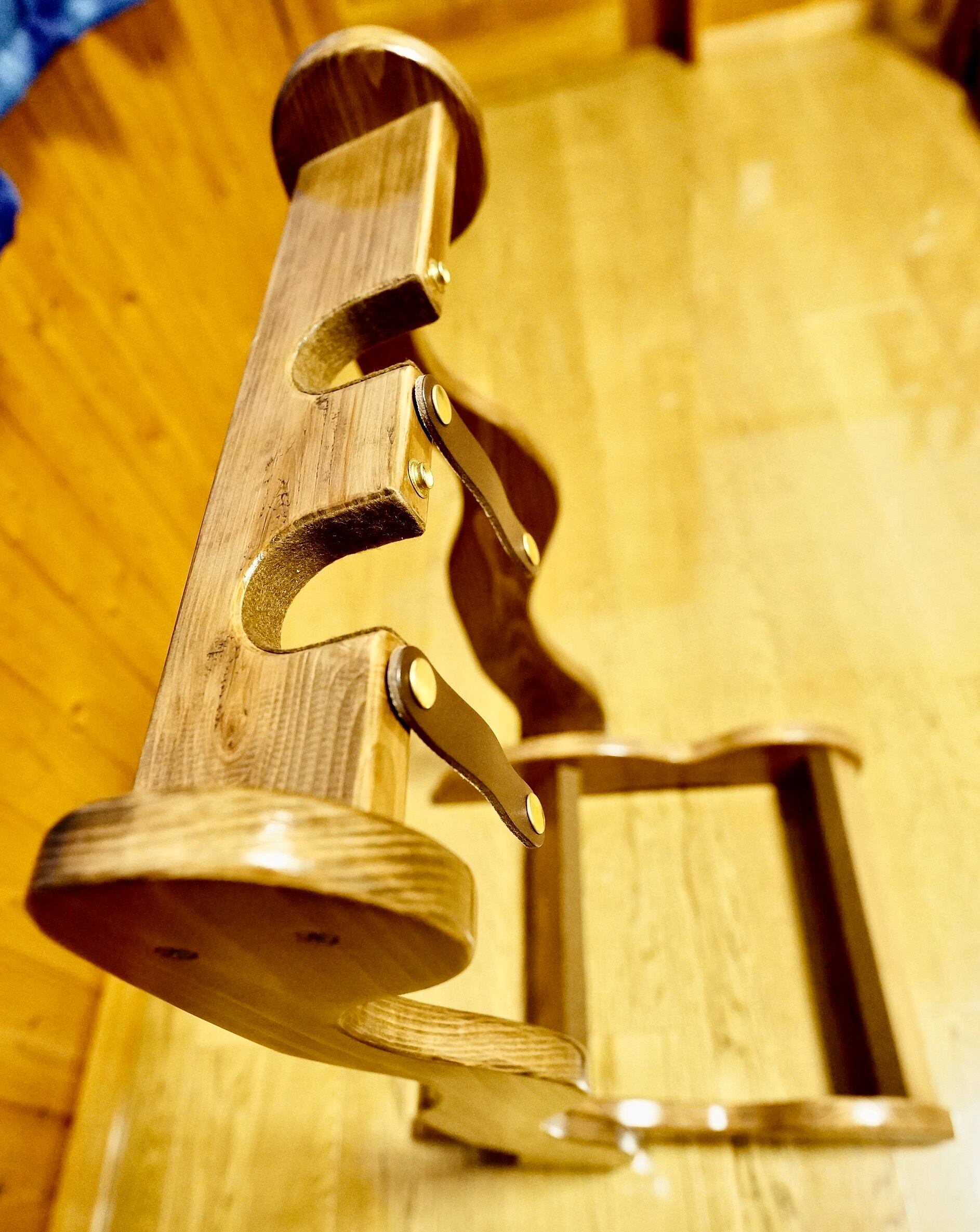 【24時間以内に発送】手作り木工 木製ギタースタンド (ニス仕上げ)2本掛け 転倒防止本革ベルト付き
