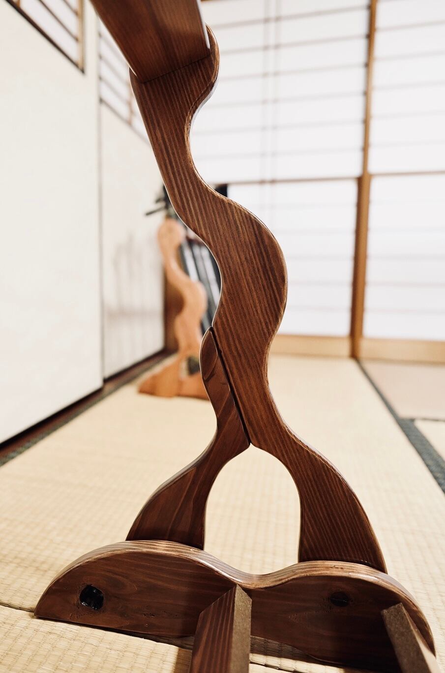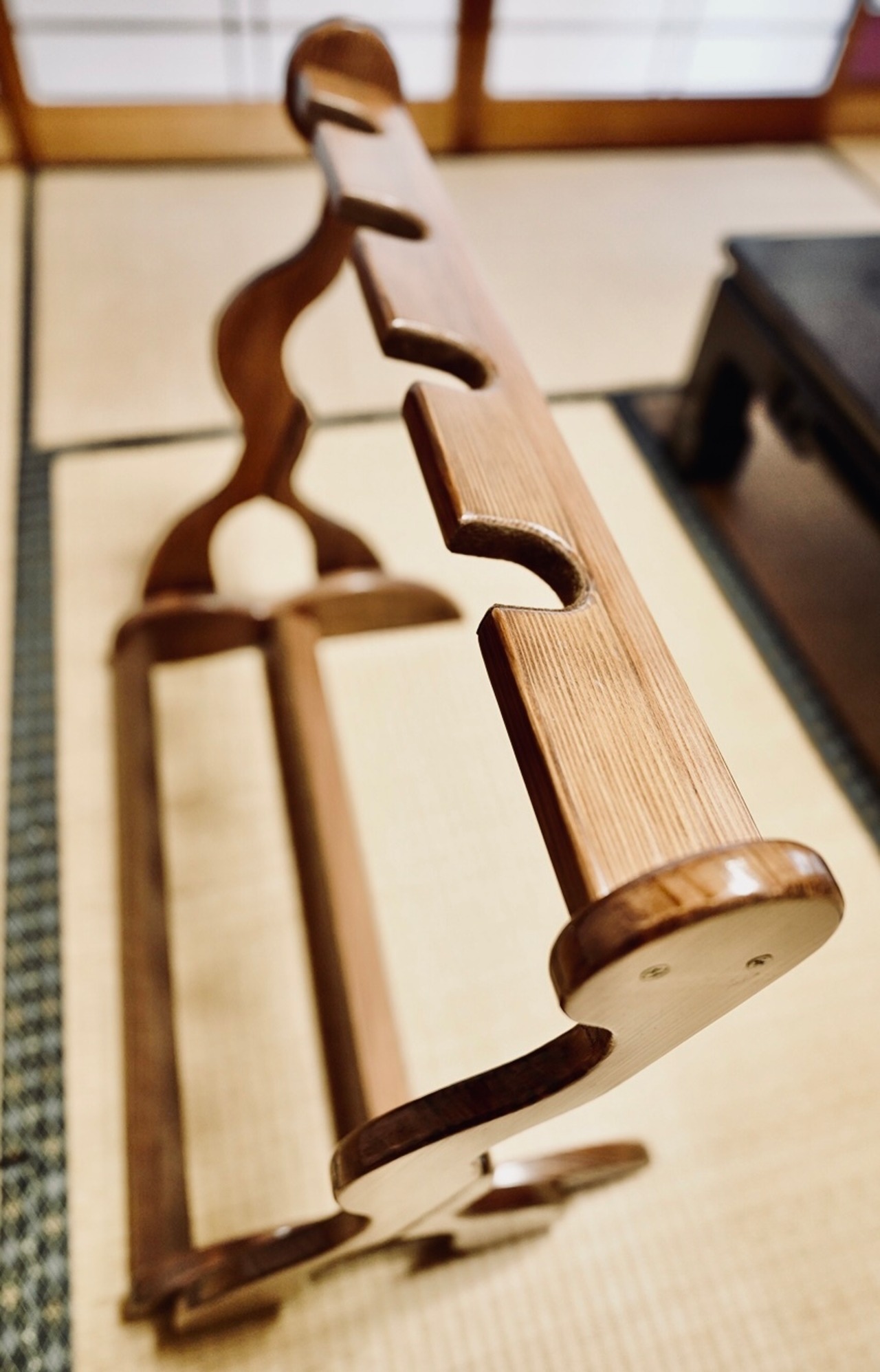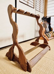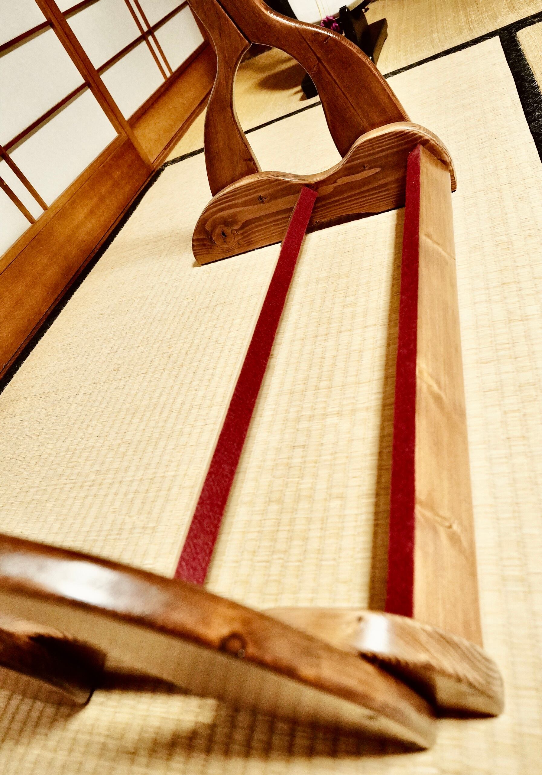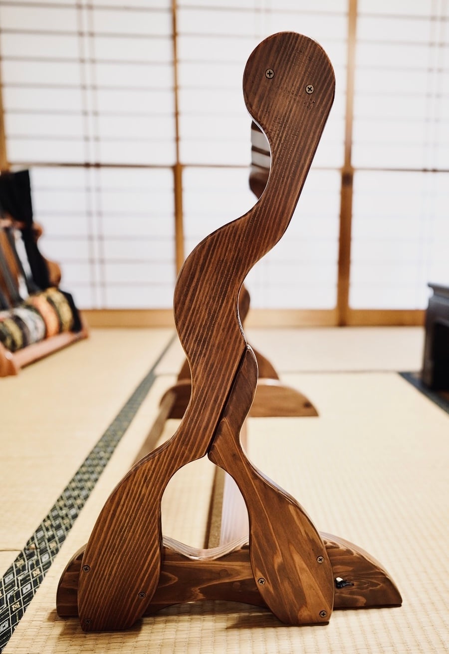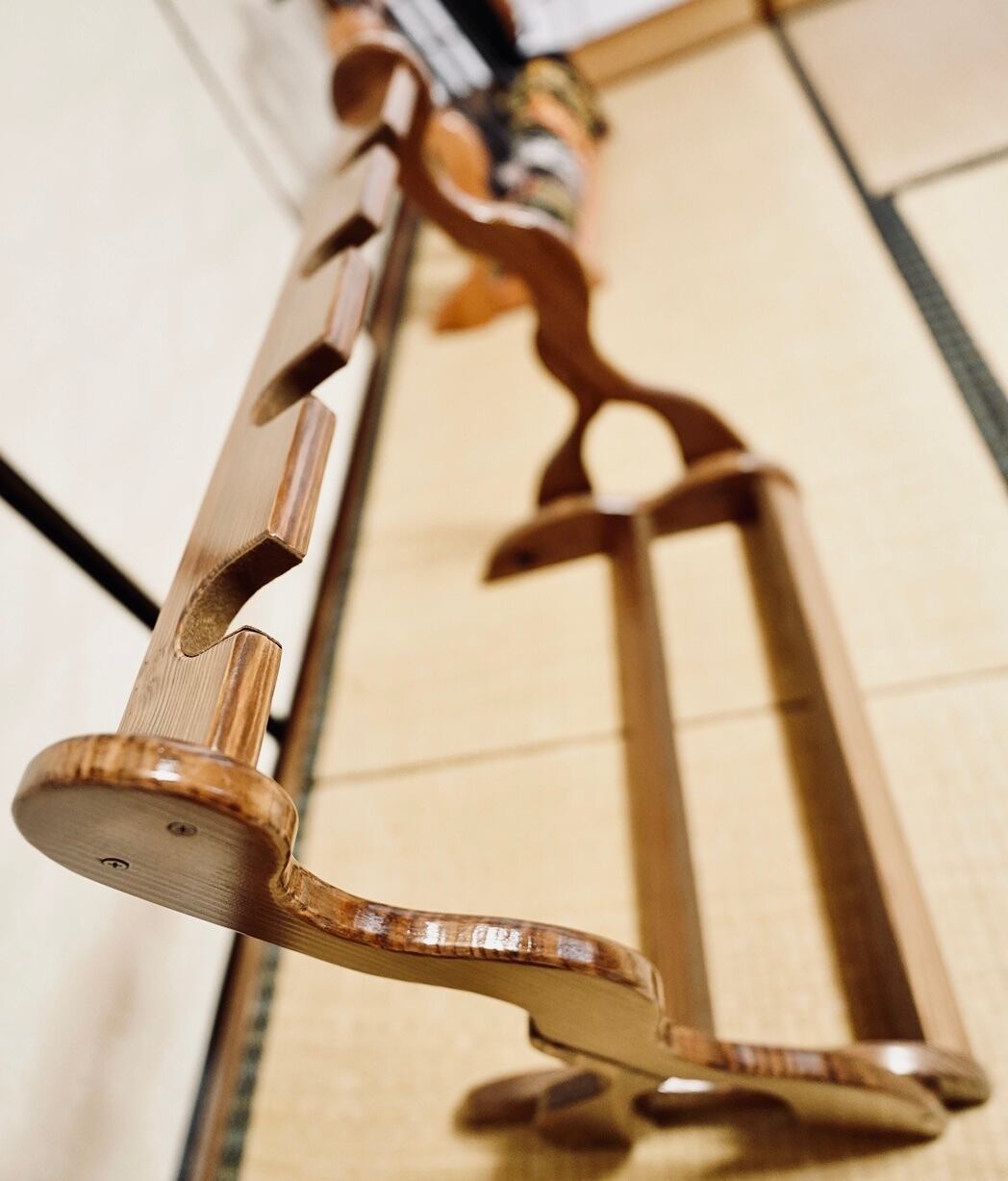 こちらは無垢材を使用したハンドメイドの三味線ラックです。