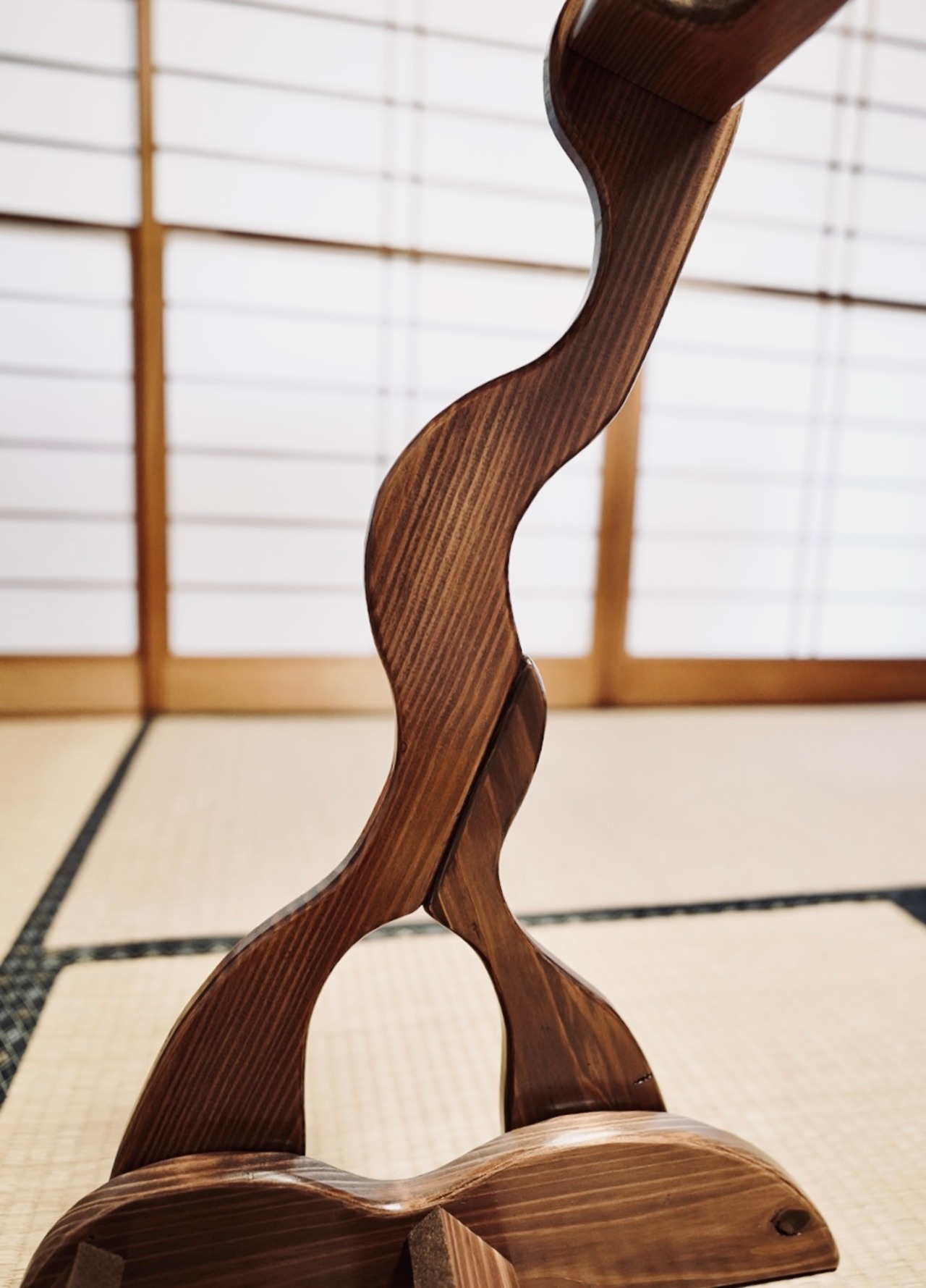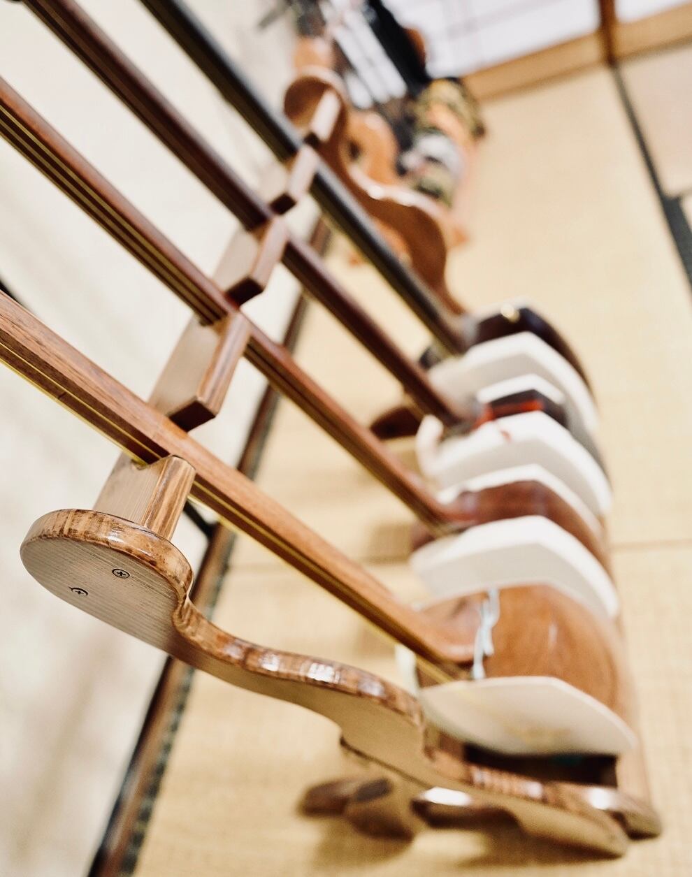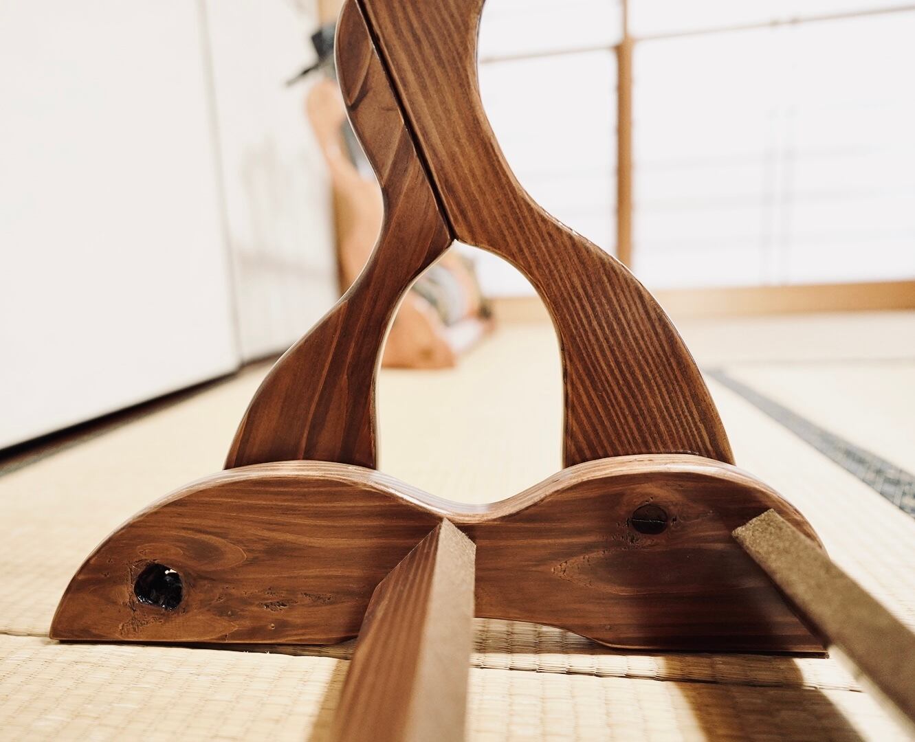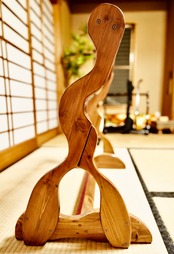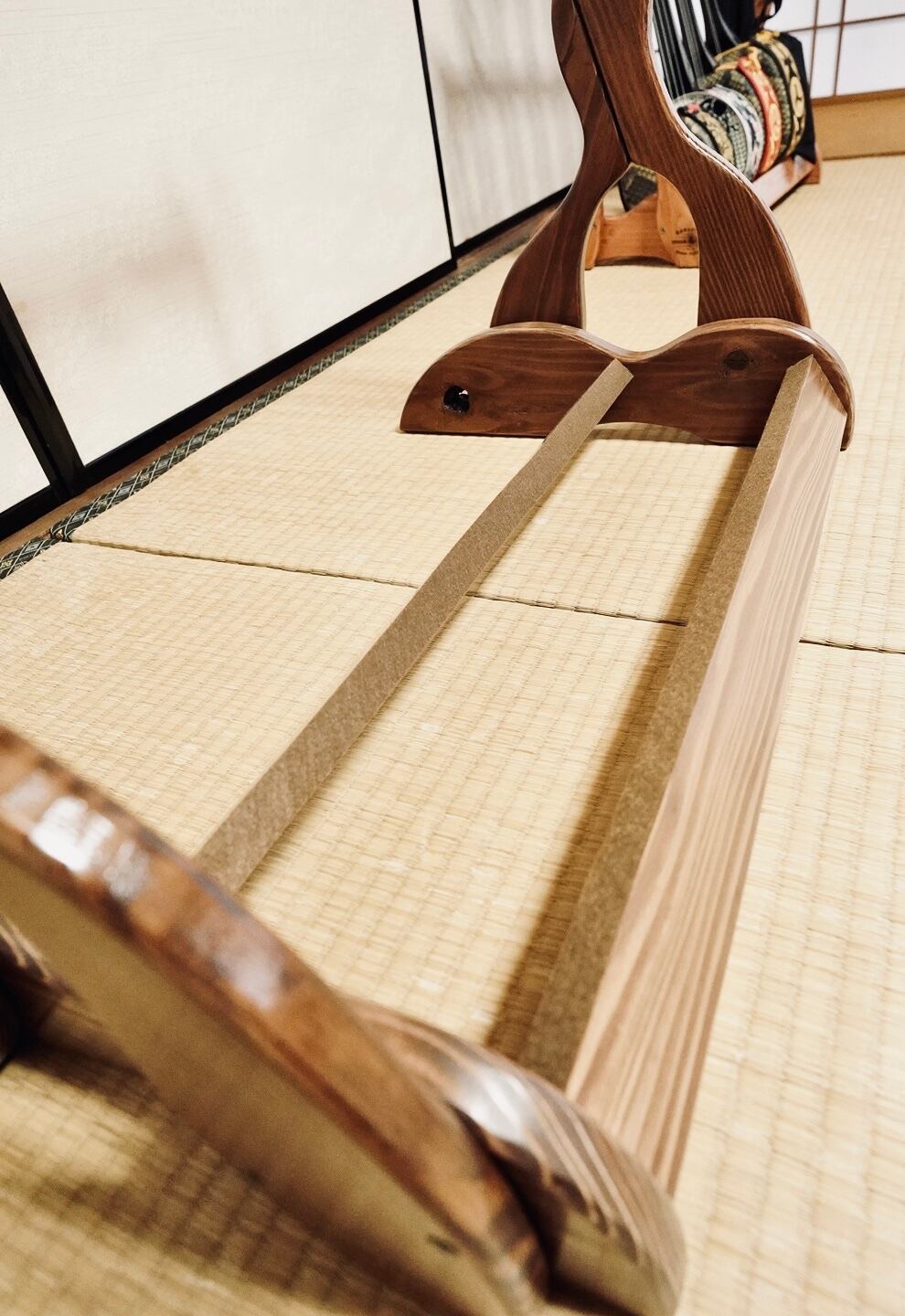 こちらは無垢材を使用したハンドメイドの三味線ラックです。