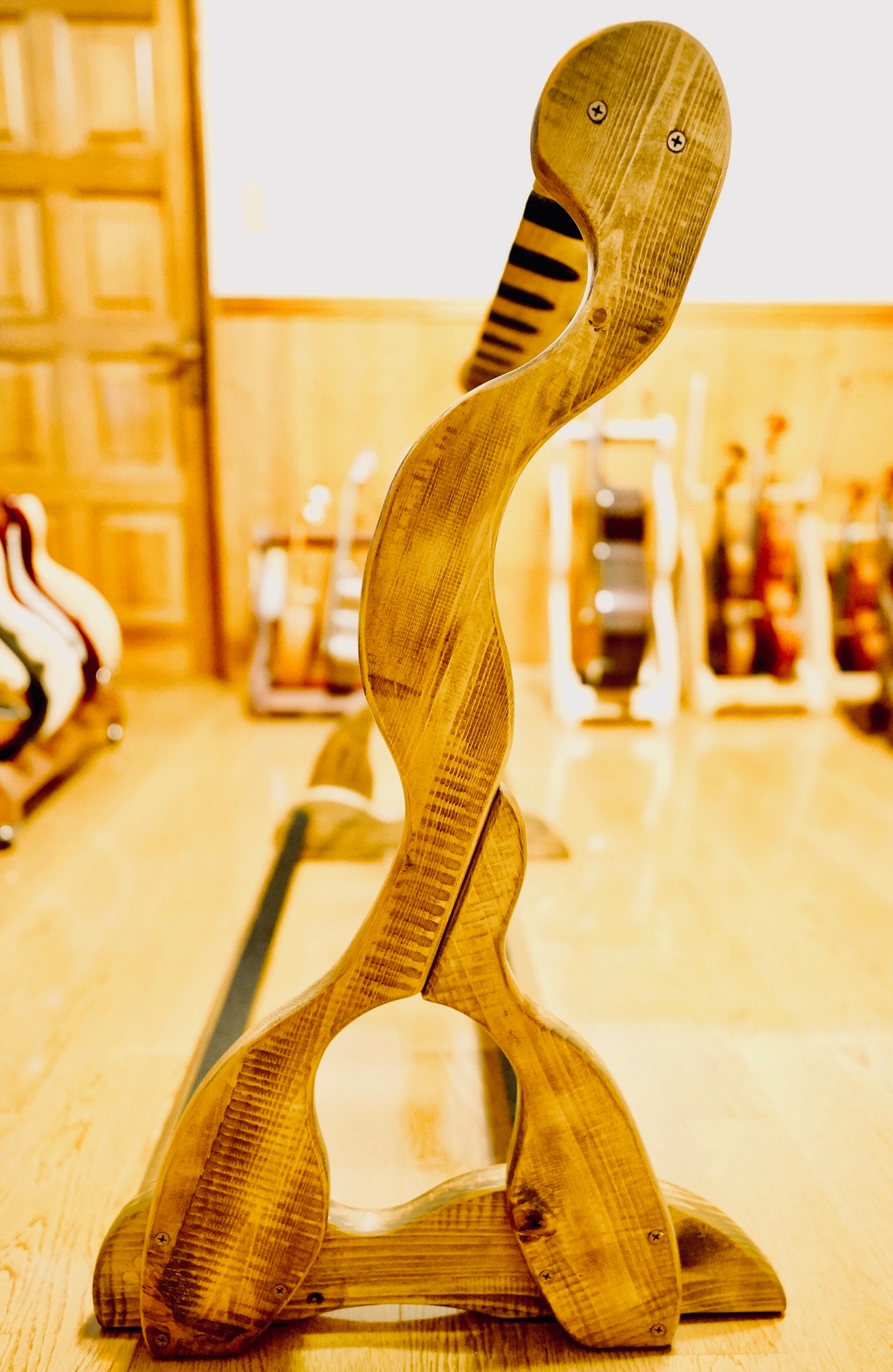 ギターを支える二本の横木は角度をつけてハの字にしてあり、ボディをしっかりとキャッチされるように設計しました。