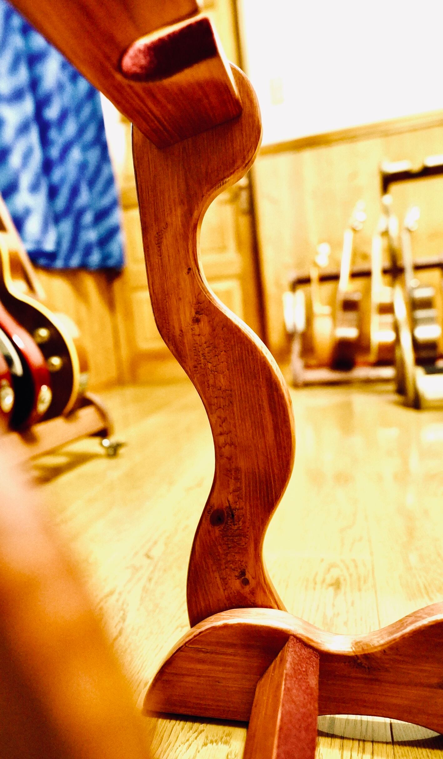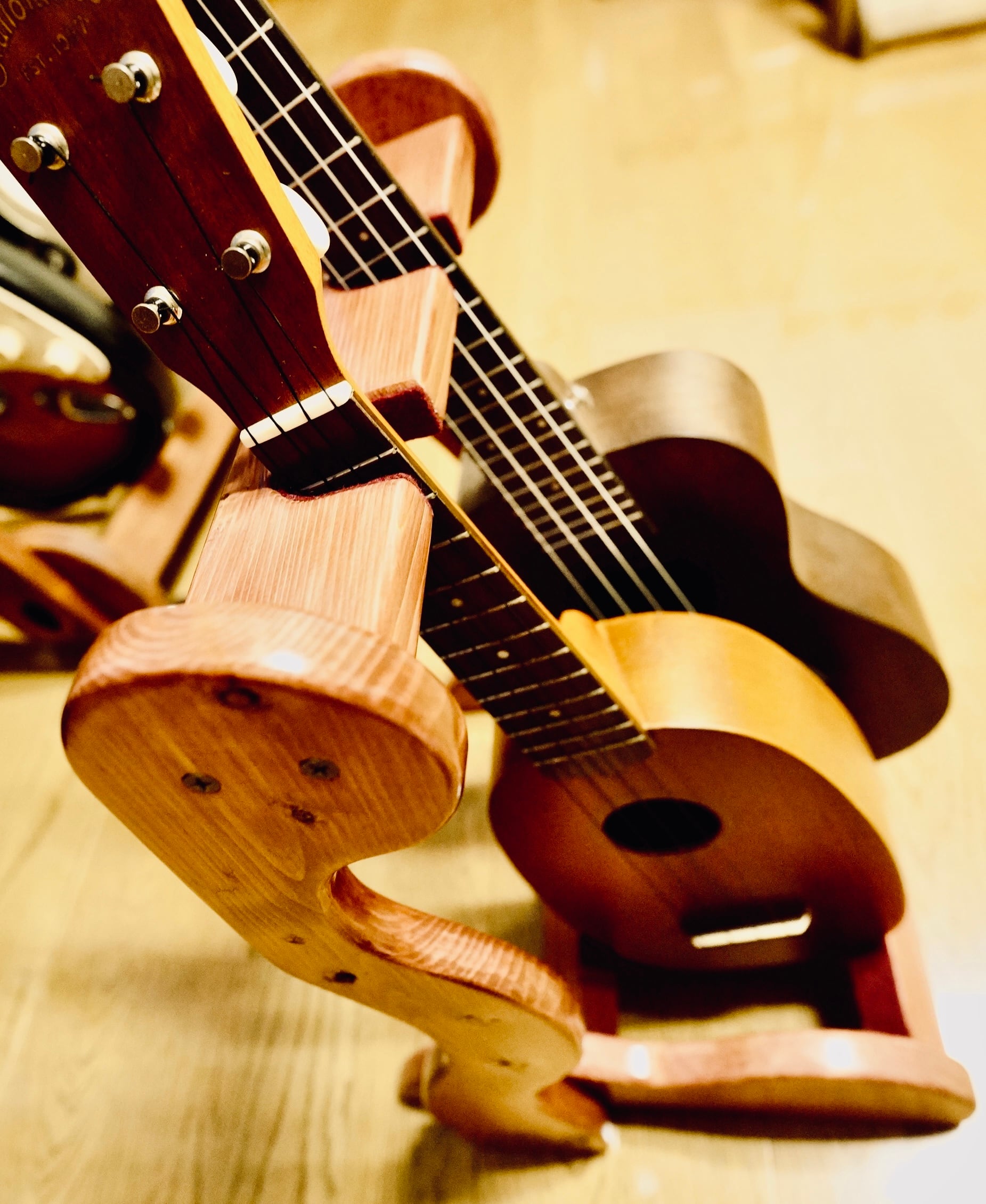 こちらは無垢材を使用したハンドメイドの2本掛け木製ウクレレスタンドです。