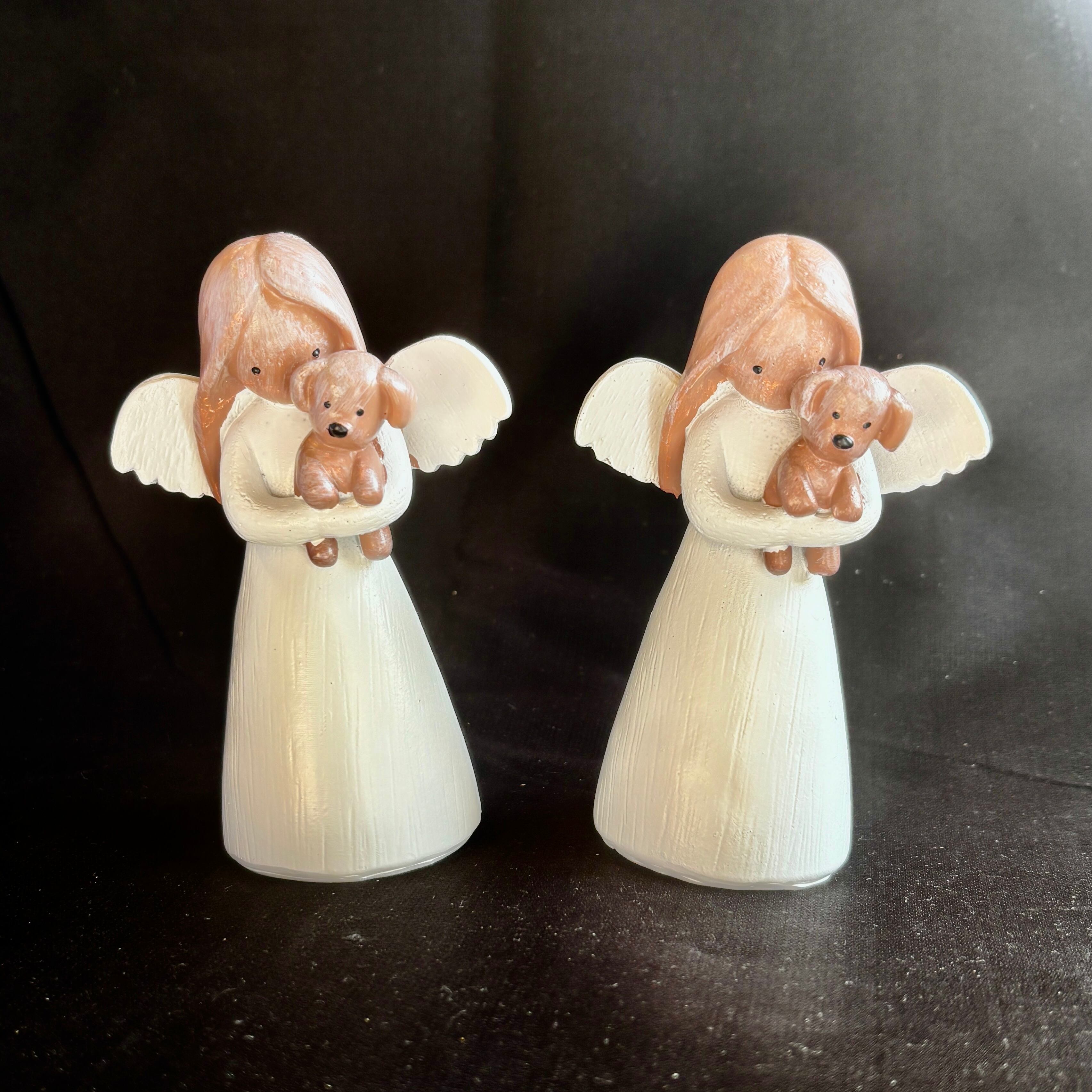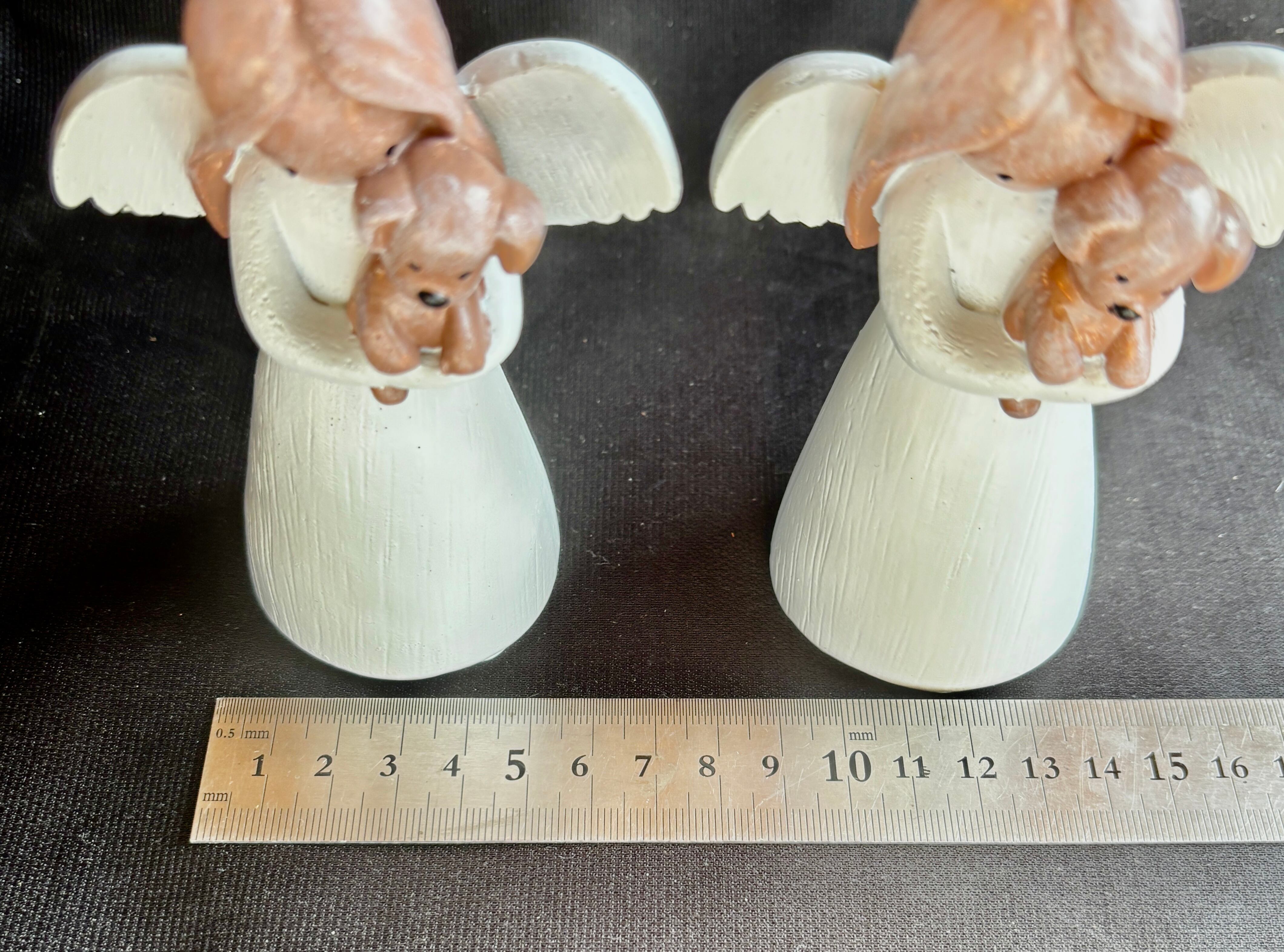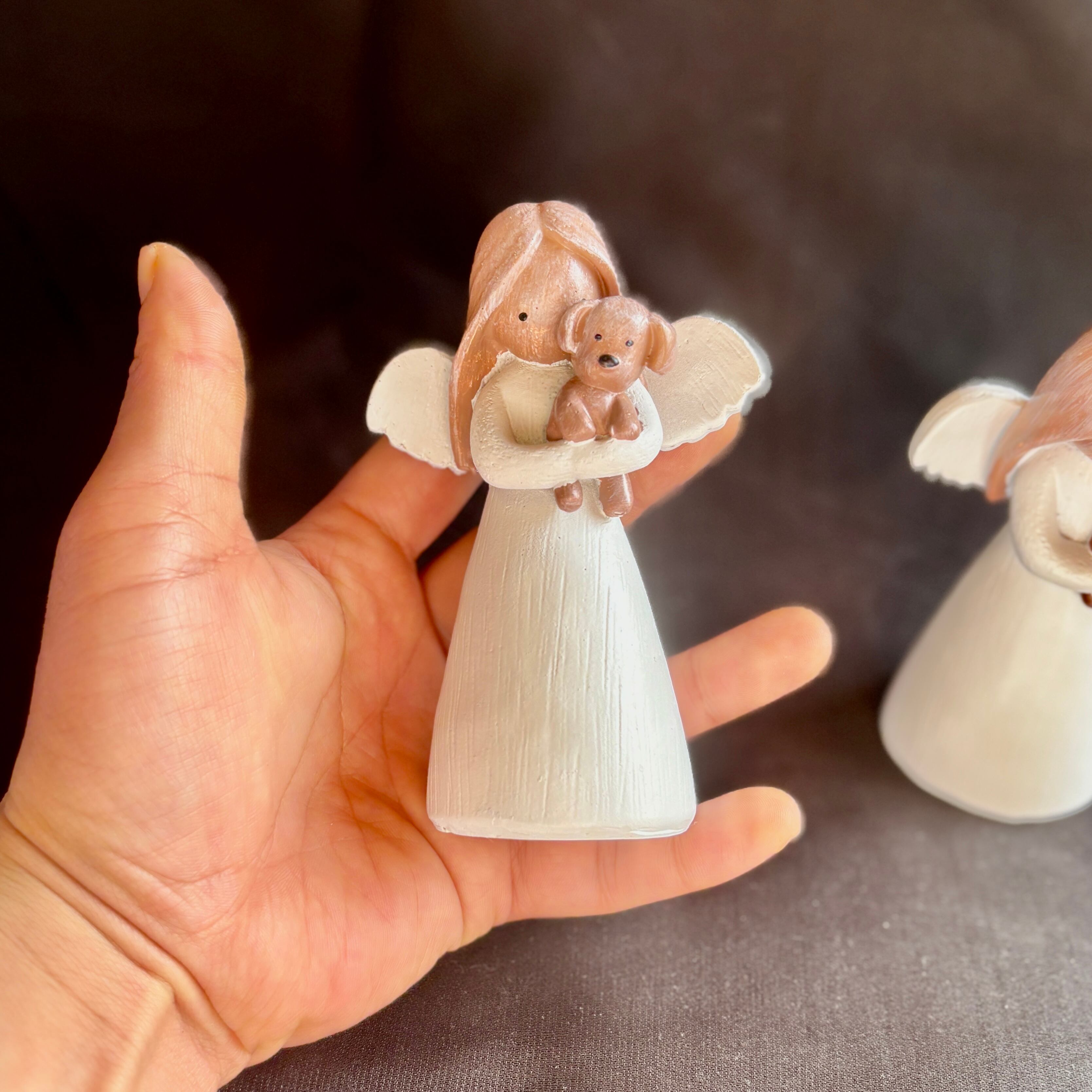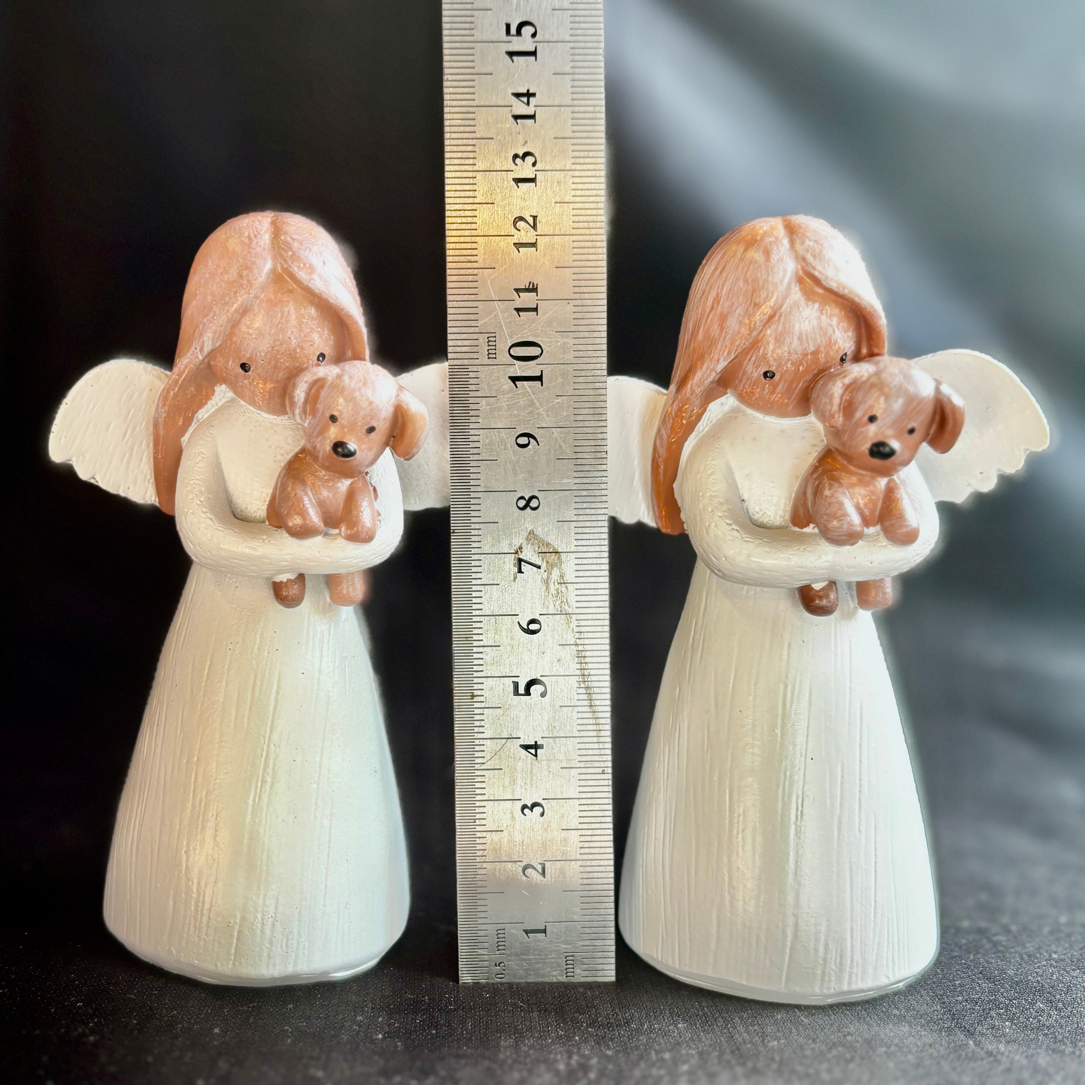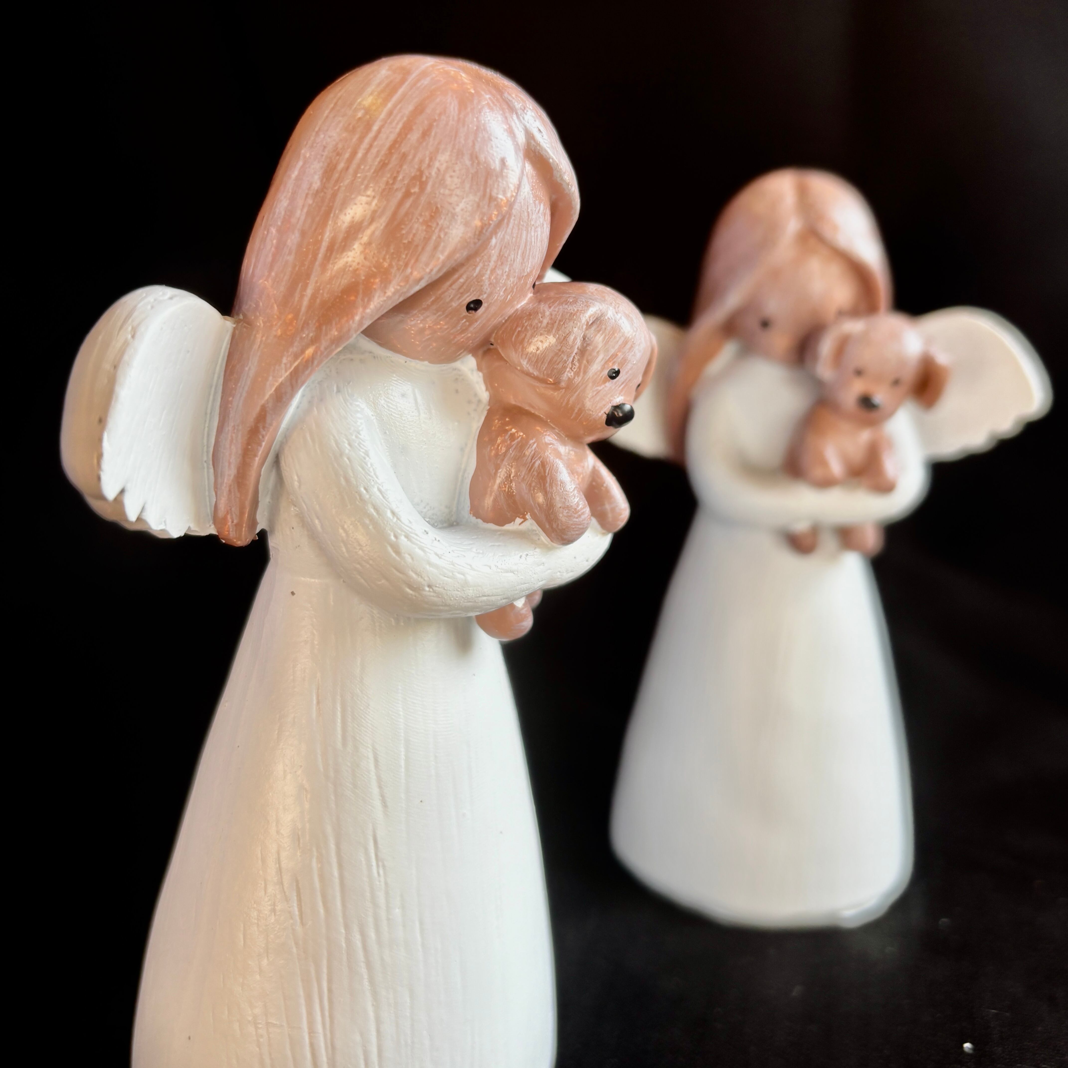 愛らしい子犬を優しく抱きしめる天使の姿が印象的な、樹脂製のフィギュアです。
