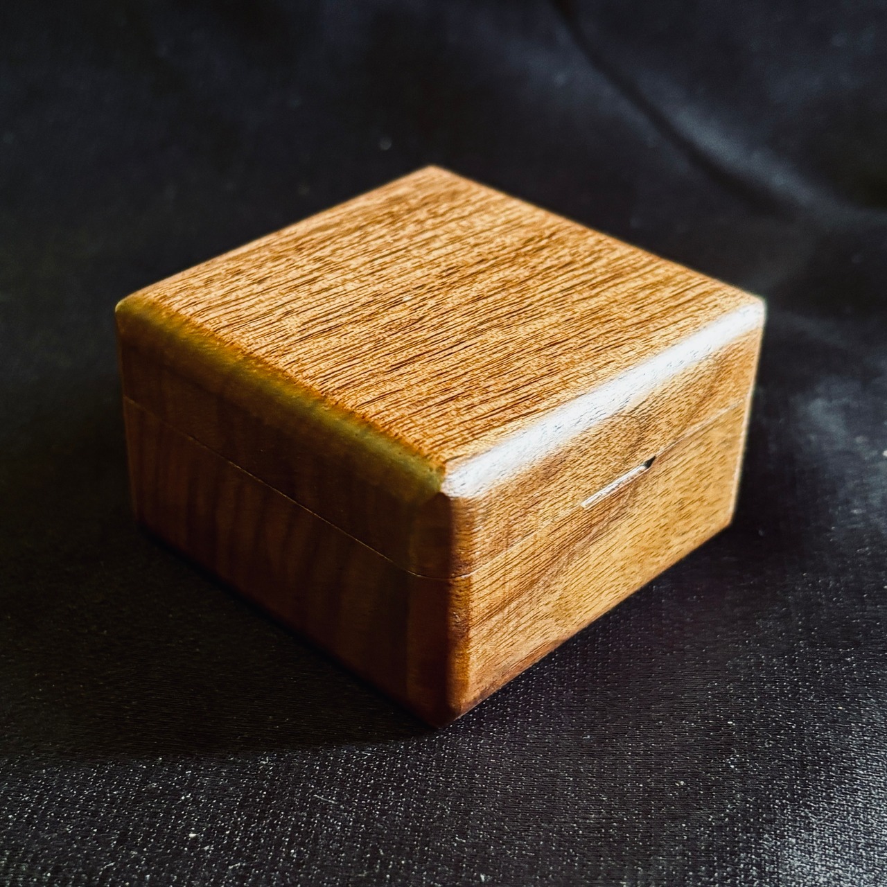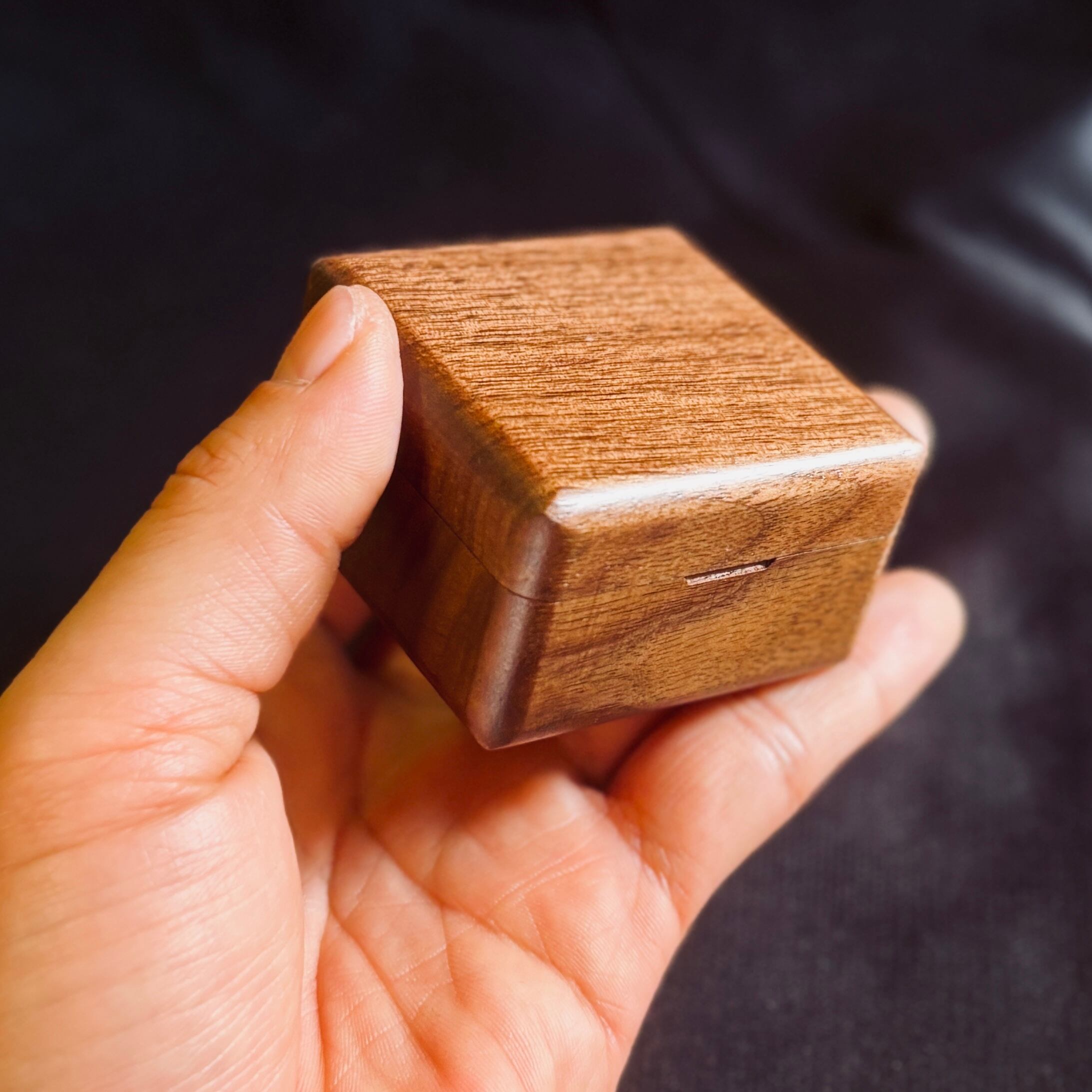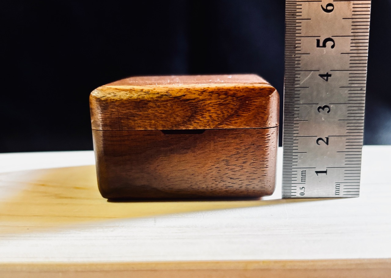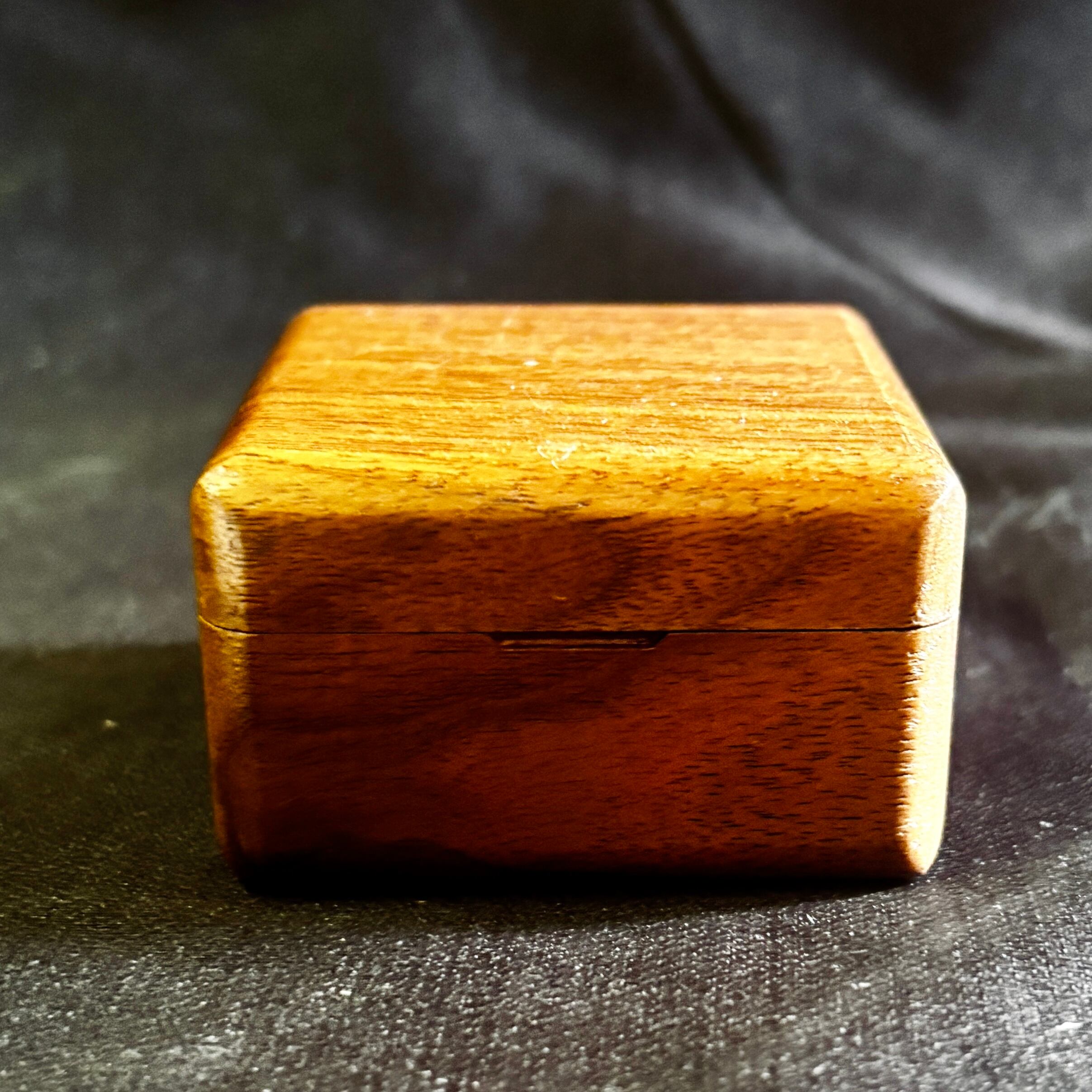 手のひらにコロンと収まるサイズ感(約60mm四方)ながら、無垢材ならではの重厚感と気品を兼ね備えた、特別な一箱です。