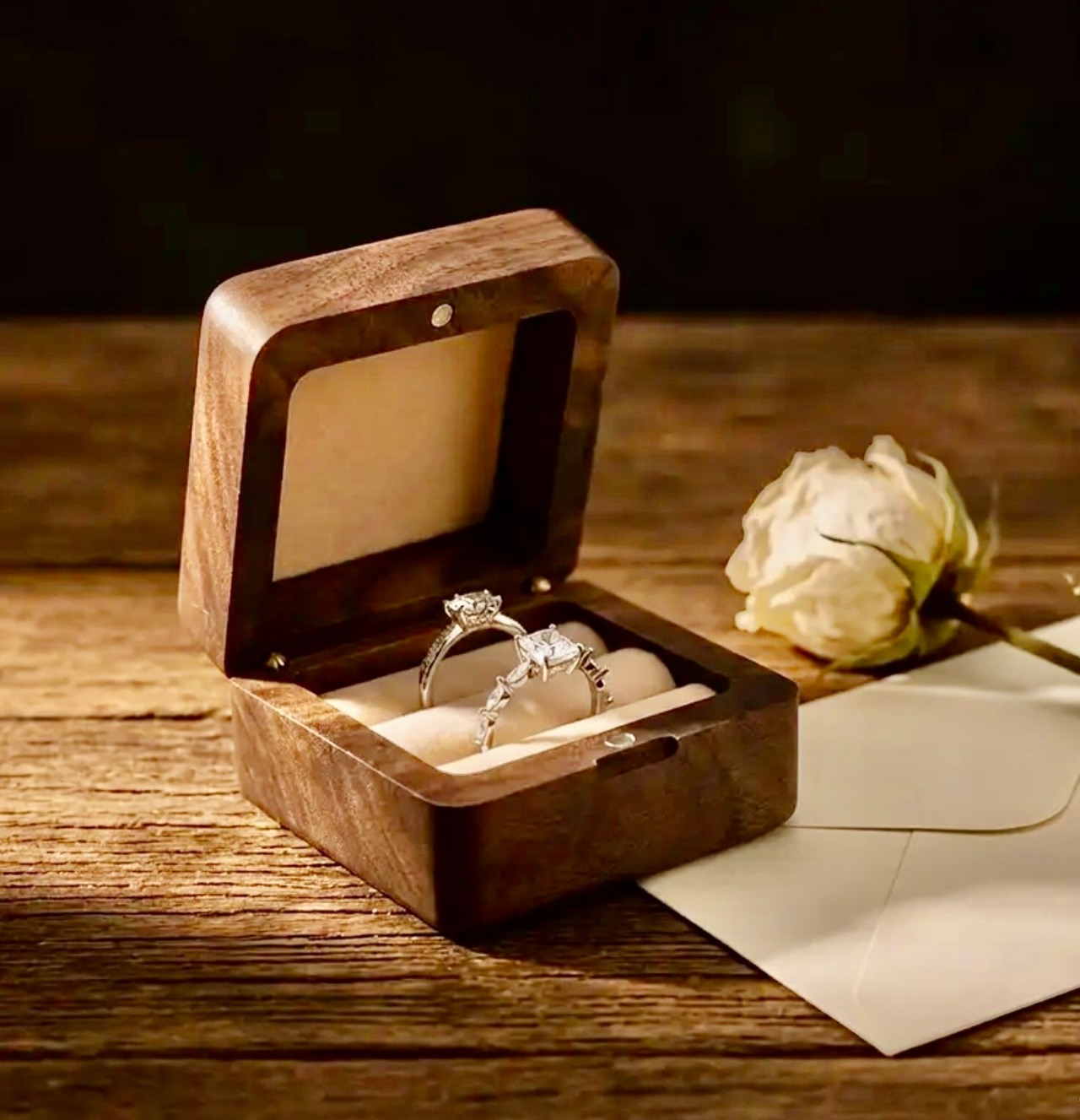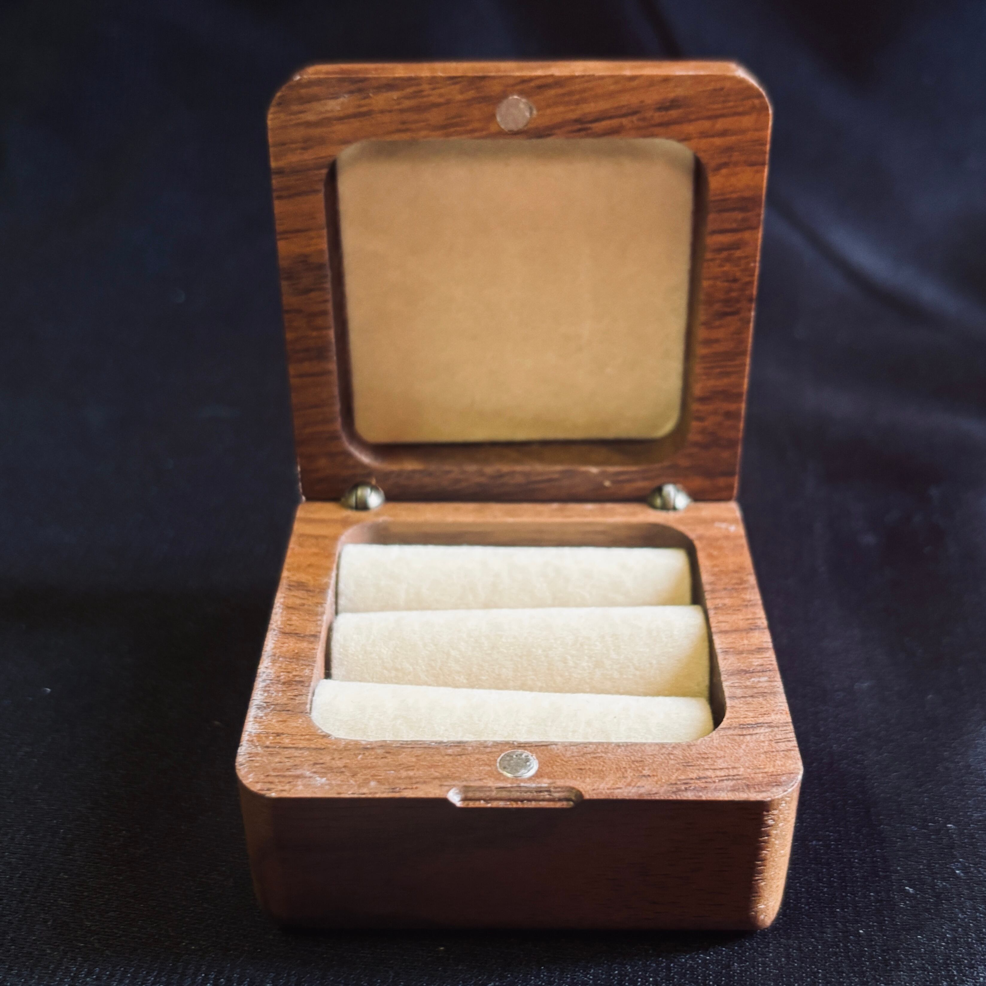 大切なふたつの指輪を木の温もりが優しく包み込む。