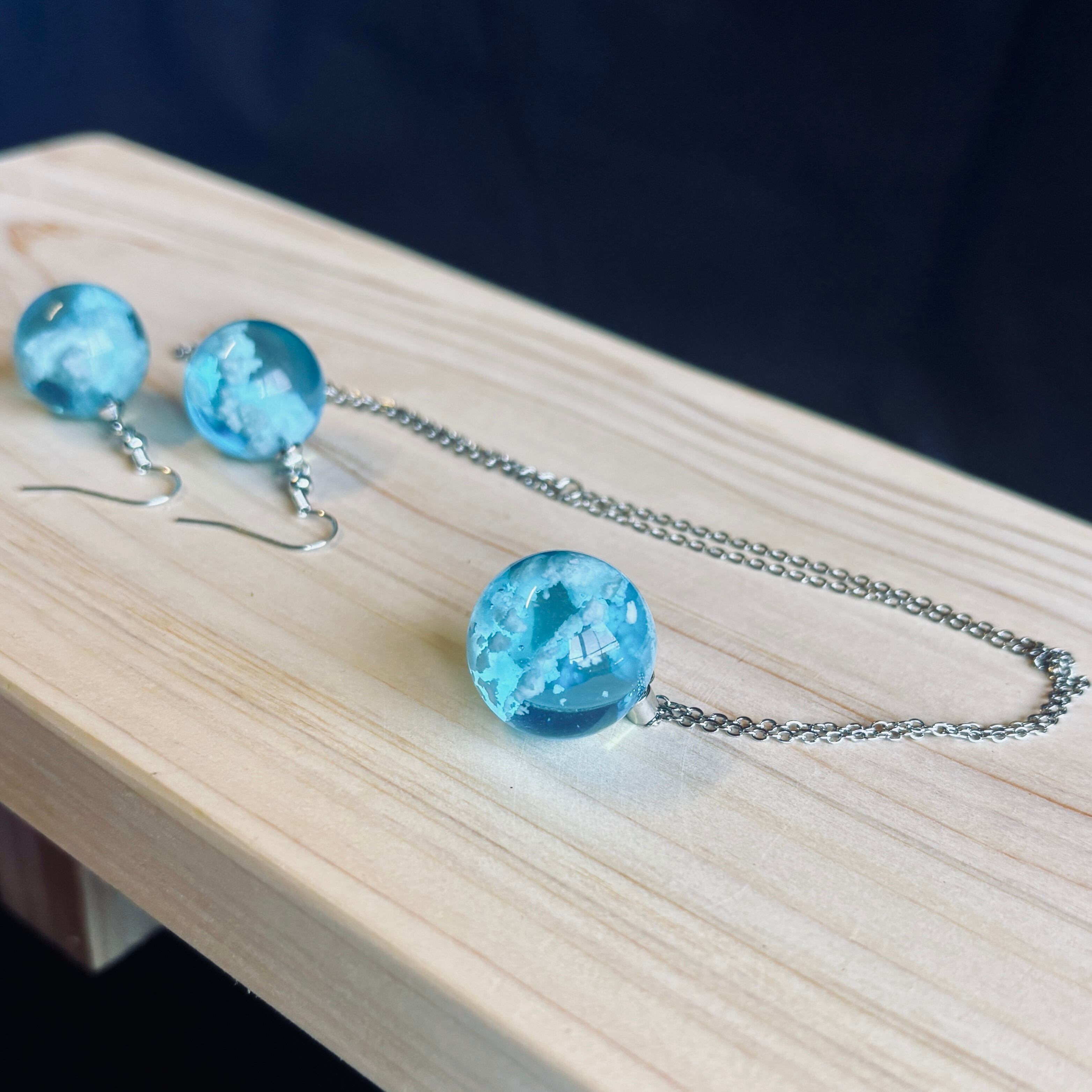 ころんと丸い球体の中に広がるブルーのグラデーションは、光を受けるたびにやわらかく表情を変え、首元と耳元に涼やかな輝きを添えてくれます。