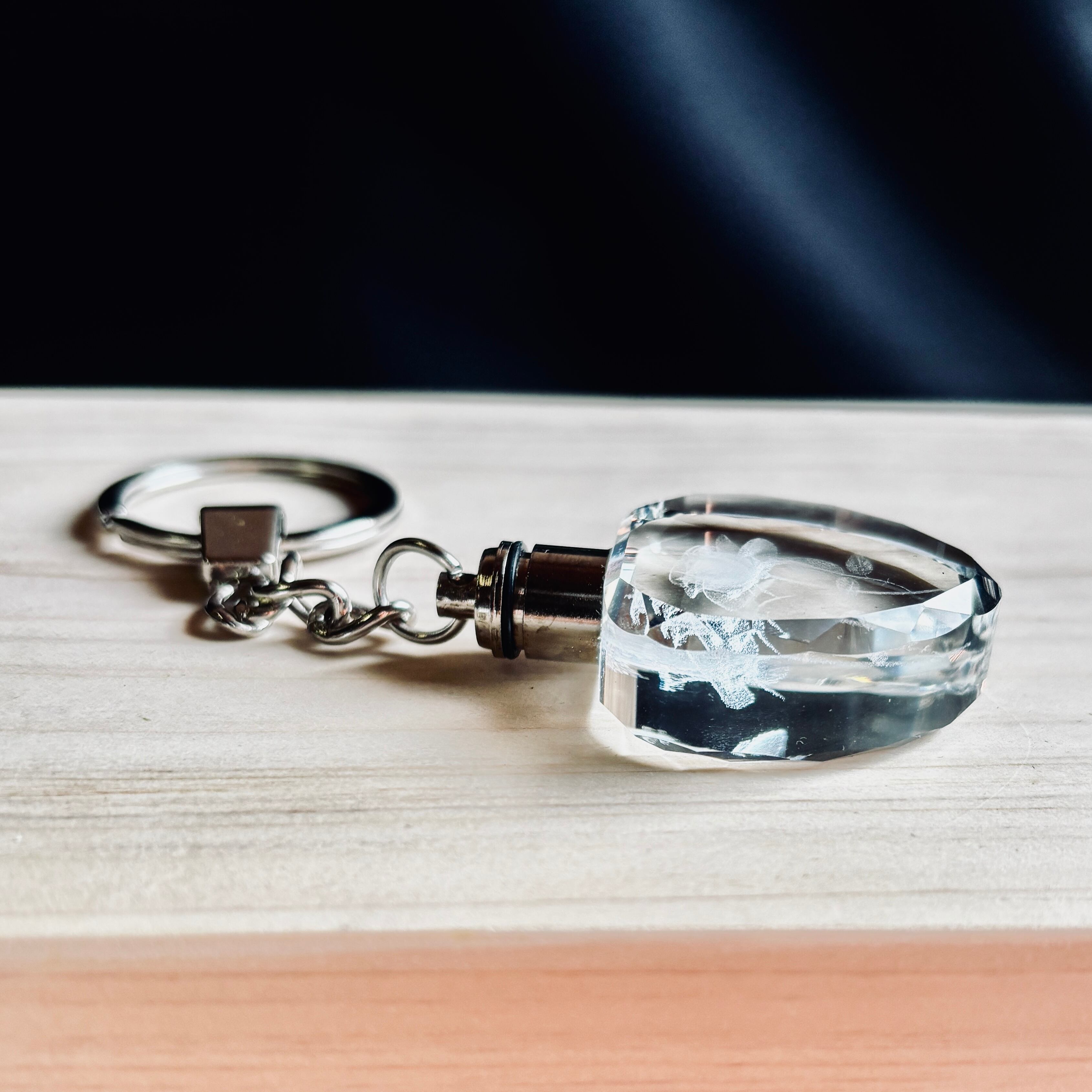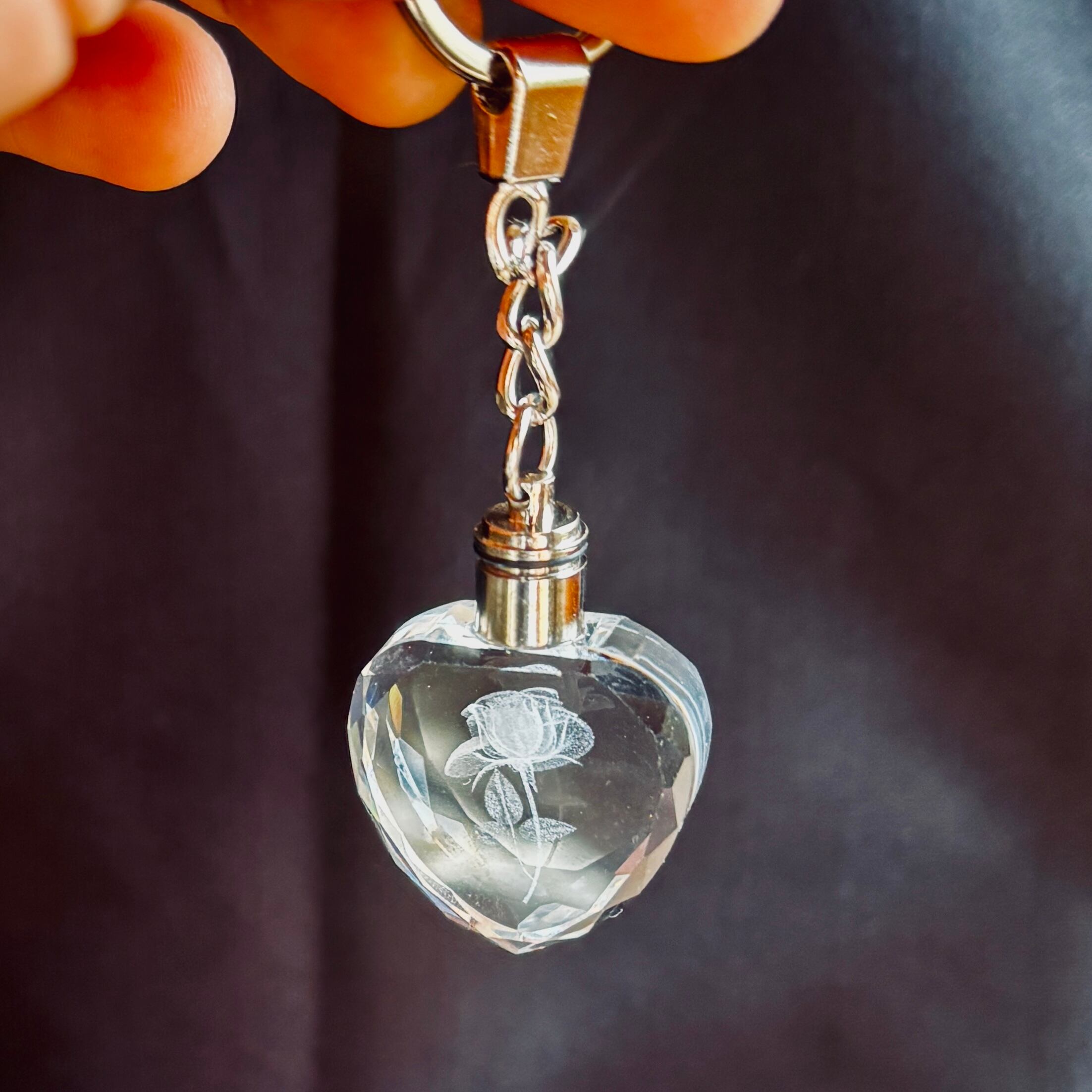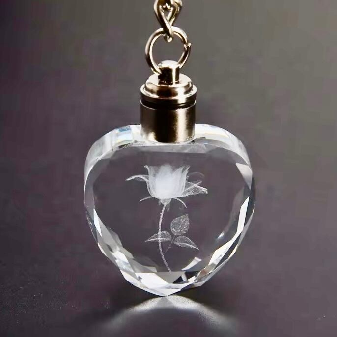 精巧な3Dレーザー彫刻でクリスタルの中に一輪の薔薇を閉じ込めた、LEDライトアップ・クリスタルキーホルダーをお届けします。