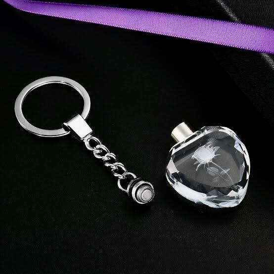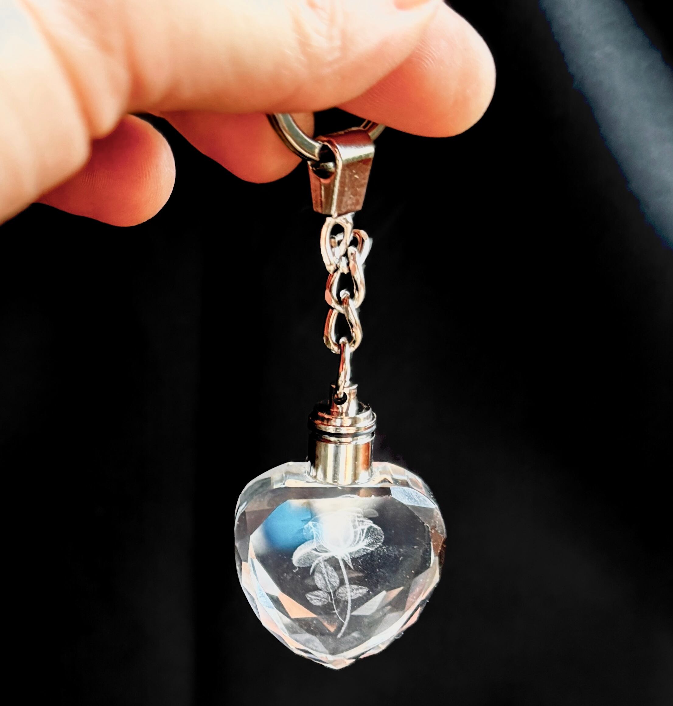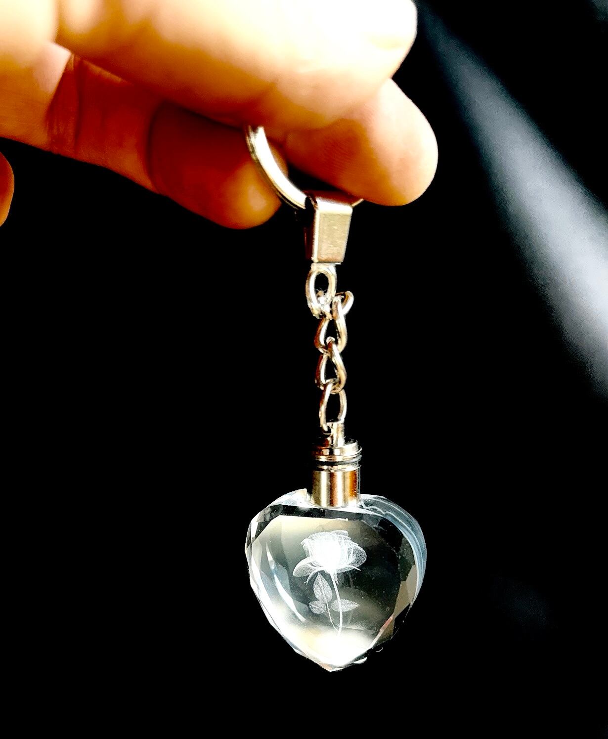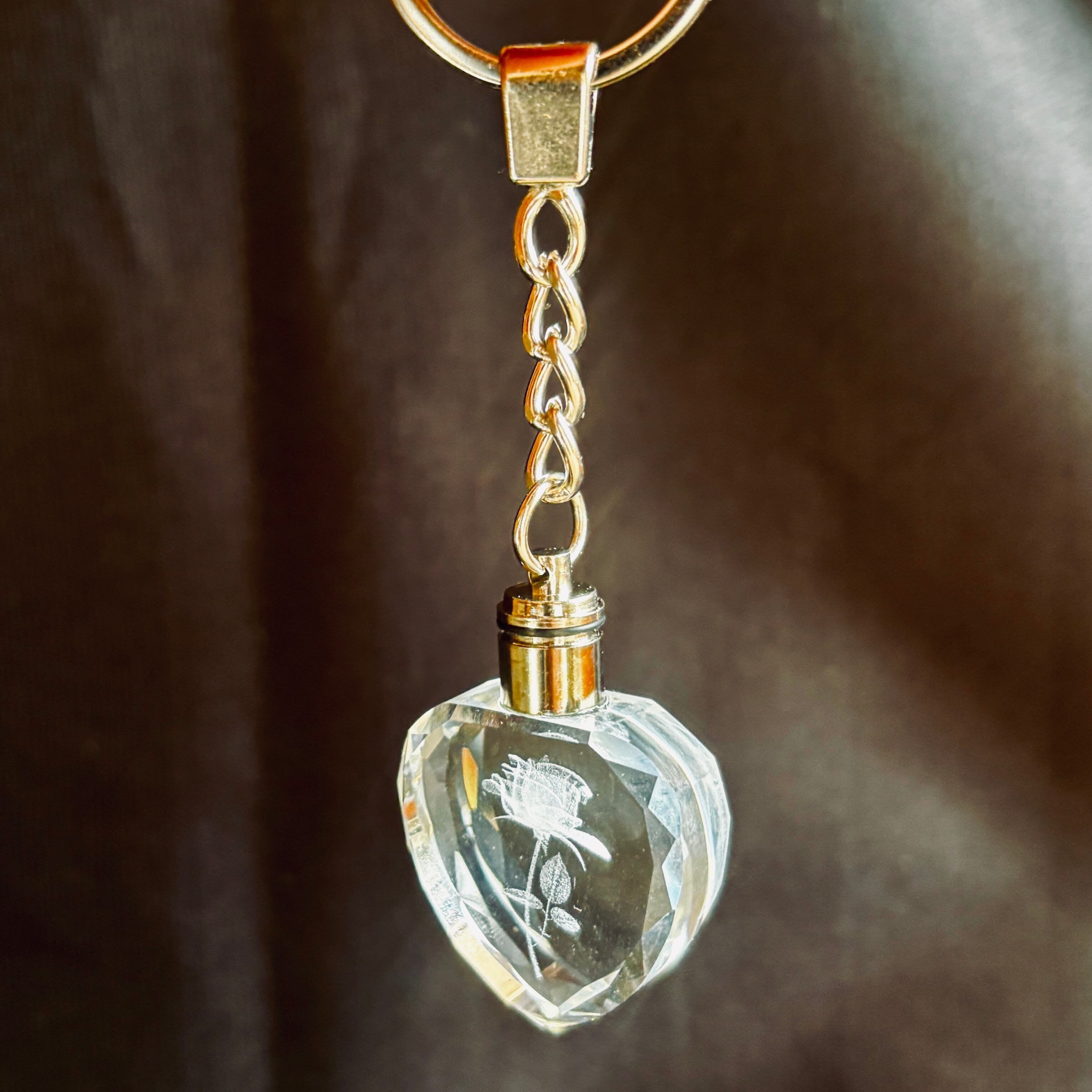 精巧な3Dレーザー彫刻でクリスタルの中に一輪の薔薇を閉じ込めた、LEDライトアップ・クリスタルキーホルダーをお届けします。