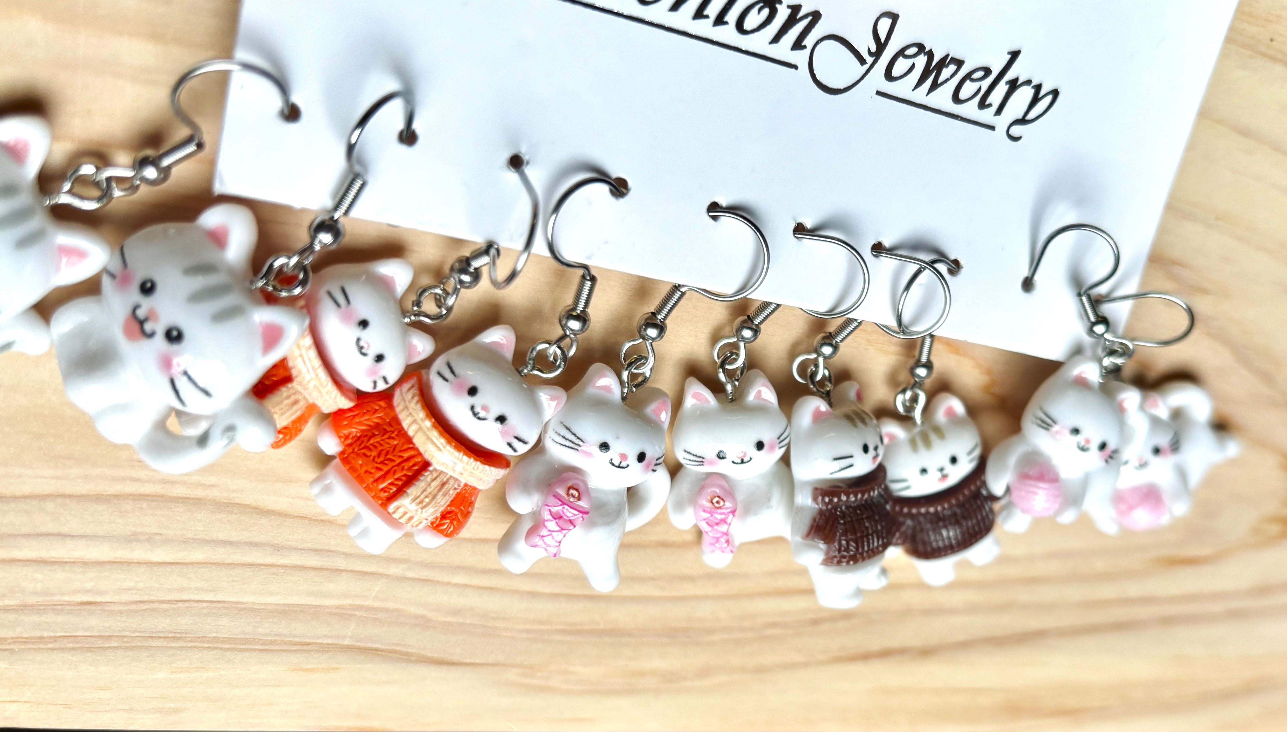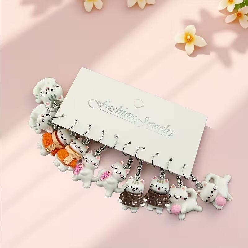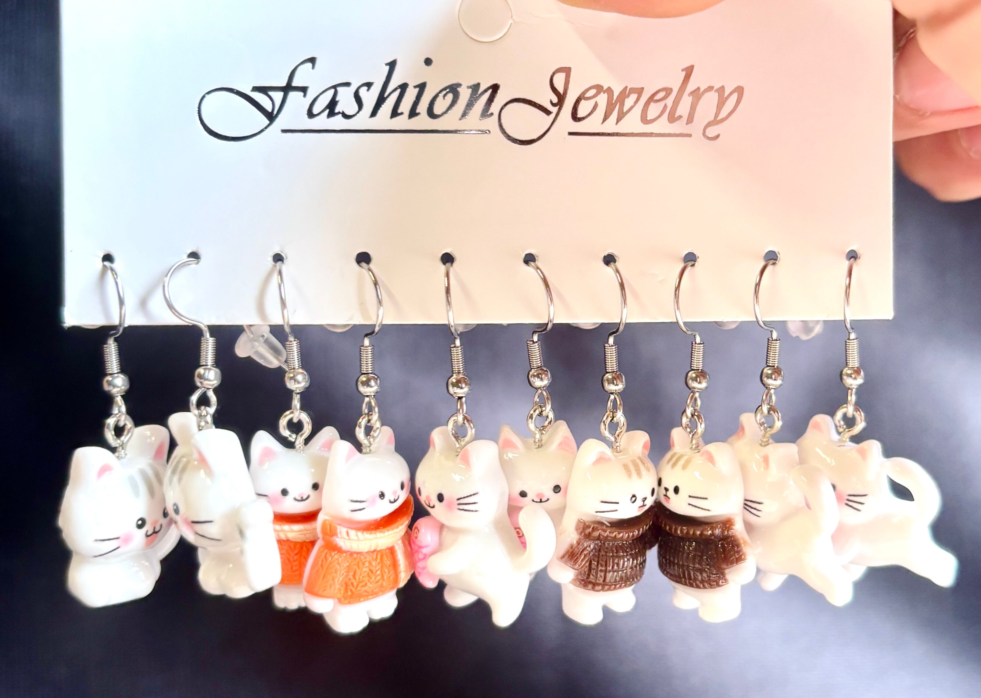 耳元でゆらゆら揺れる姿がとってもキュートな、子猫たちのイヤリング5ペア(合計10個)セットをお届けします。