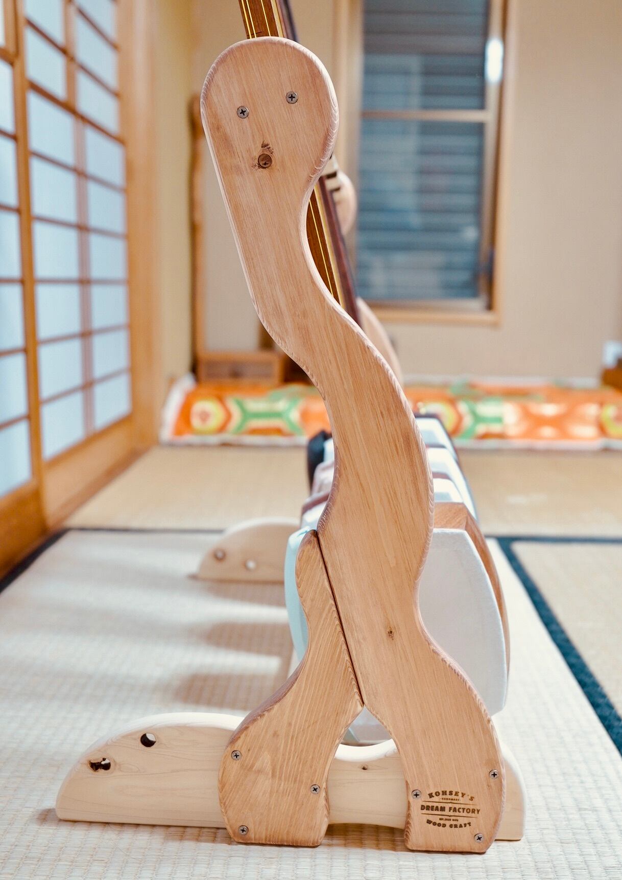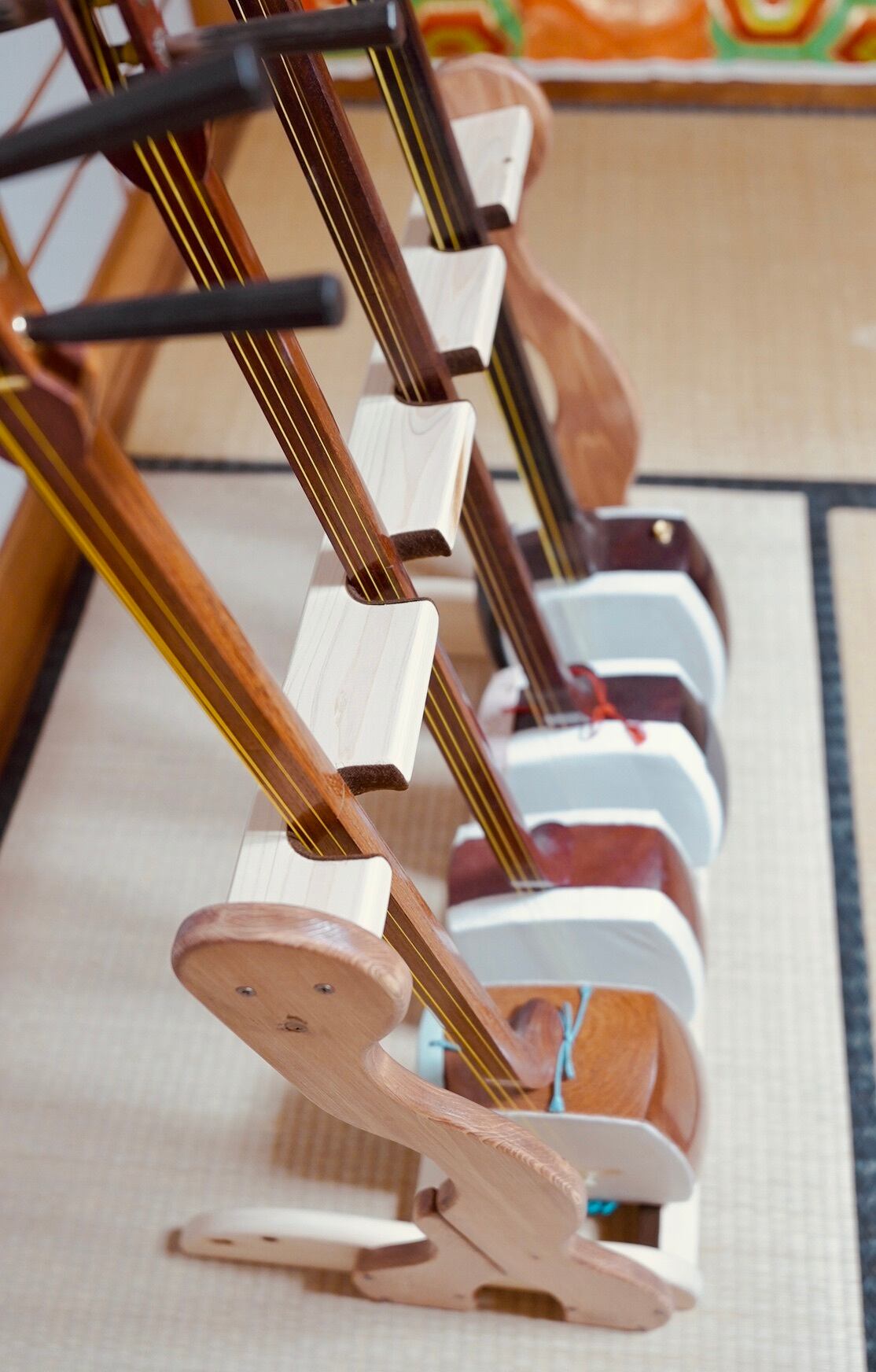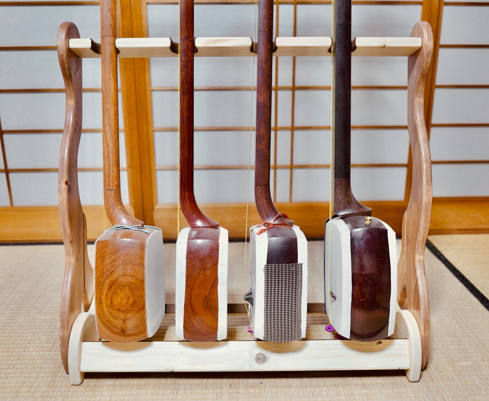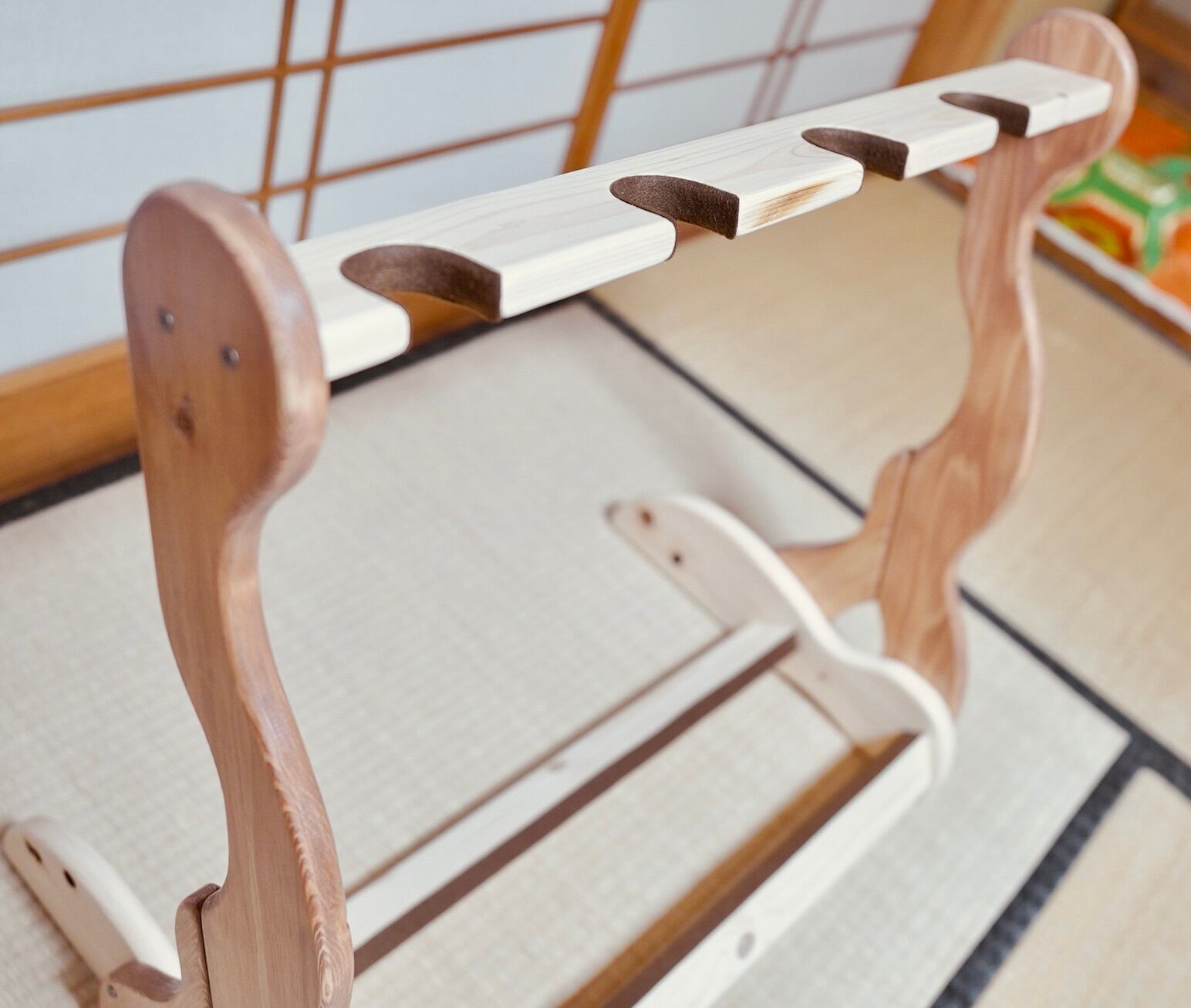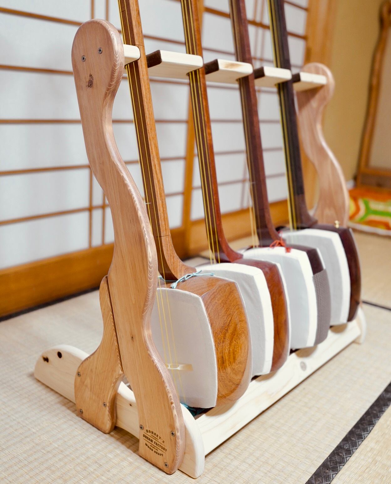 こちらは無垢材を使用したハンドメイドの三味線ラックです。
