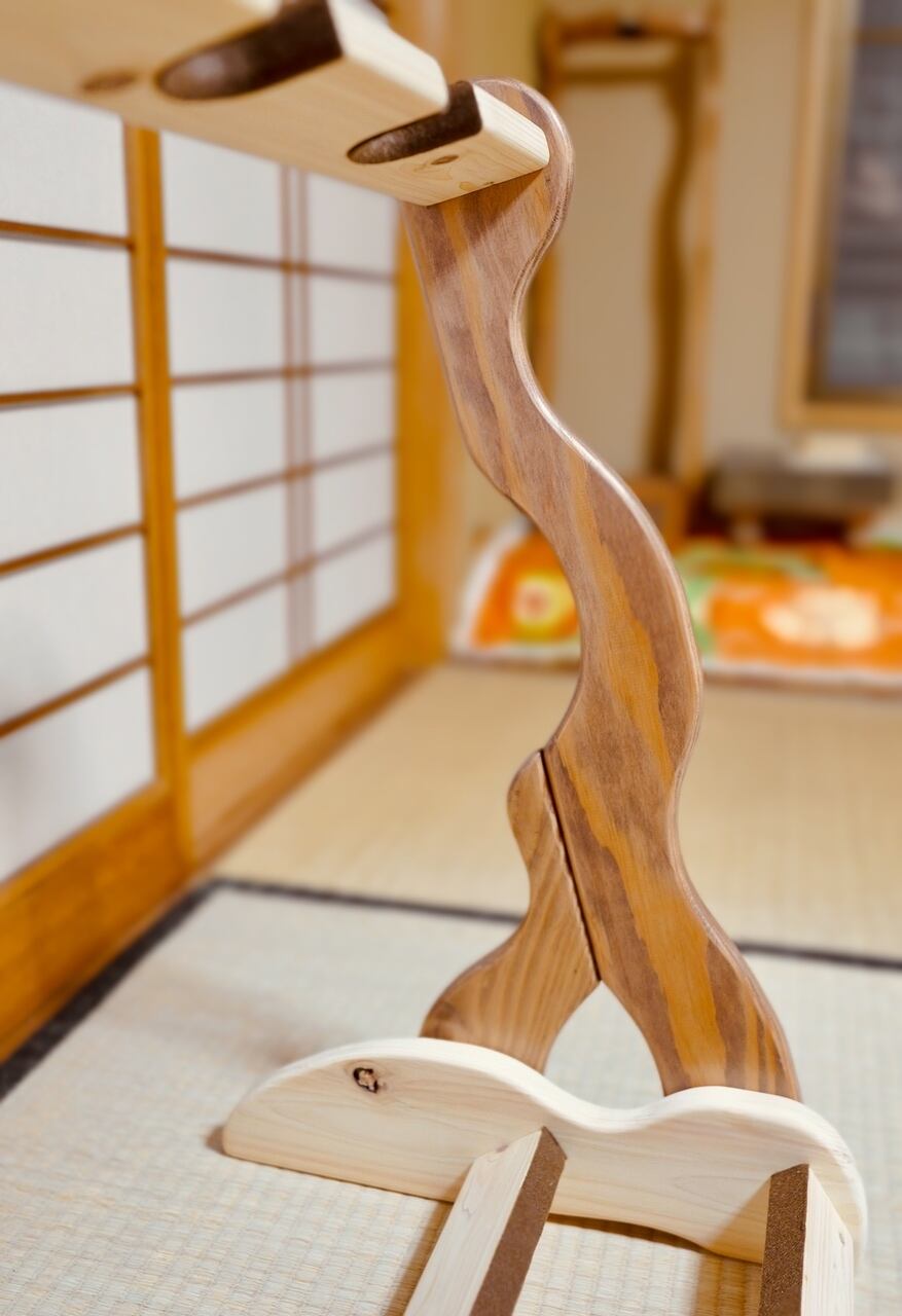 こちらは無垢材を使用したハンドメイドの三味線ラックです。