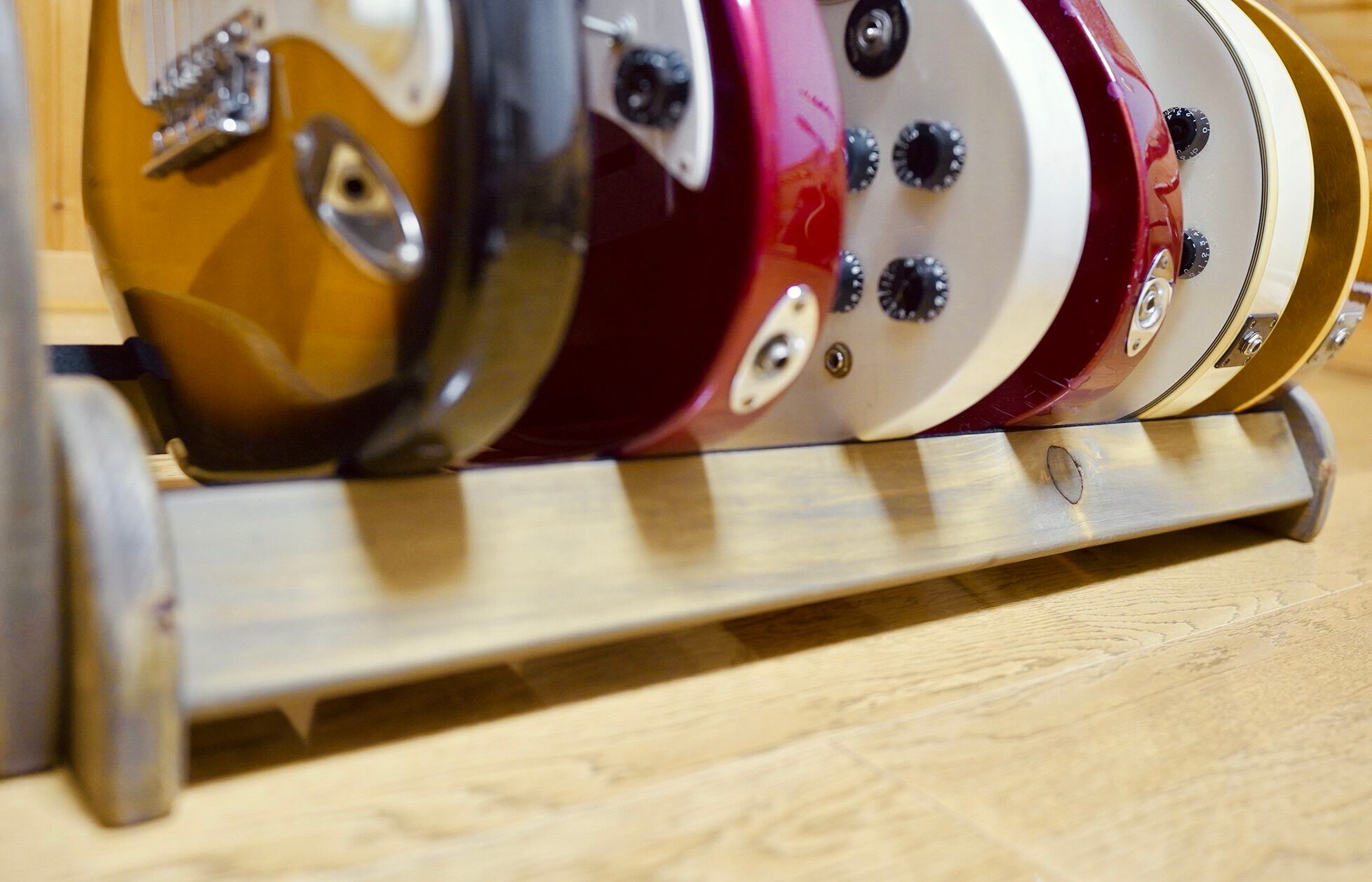 ギターのボディを支える二本の横木は角度をつけてハの字にしてあり、ボディをしっかりとキャッチできるように設計されています。