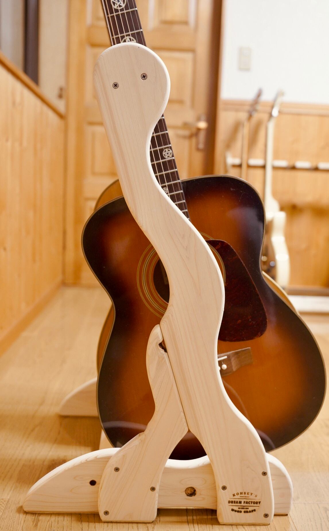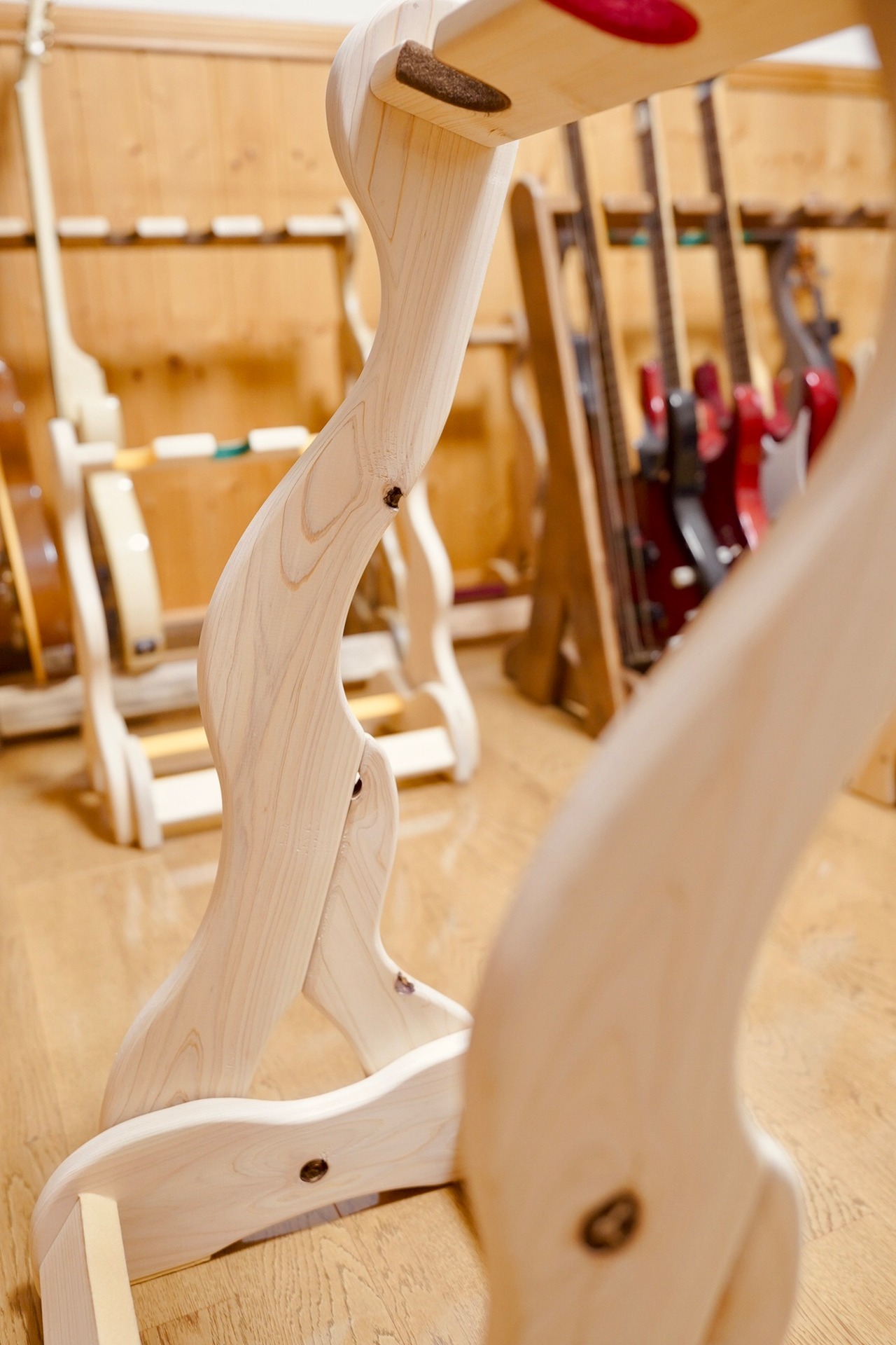 ギターのボディを支える二本の横木は角度をつけてハの字にしてあり、ボディをしっかりとキャッチできるように設計されています。
