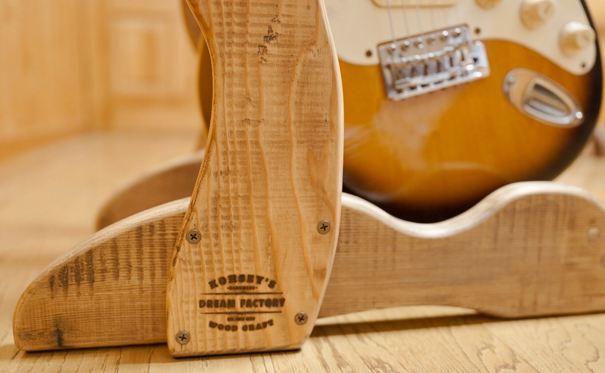 ギターのボディを支える二本の横木は角度をつけてハの字にしてあり、ボディをしっかりとキャッチできるように設計されています。
