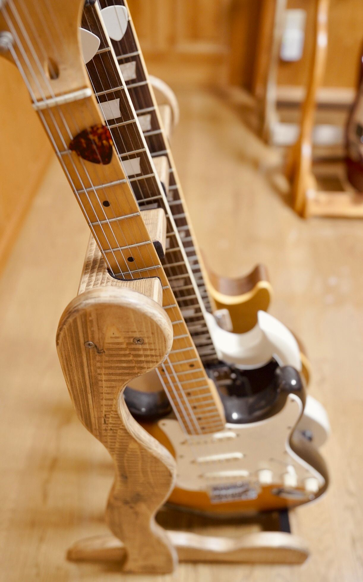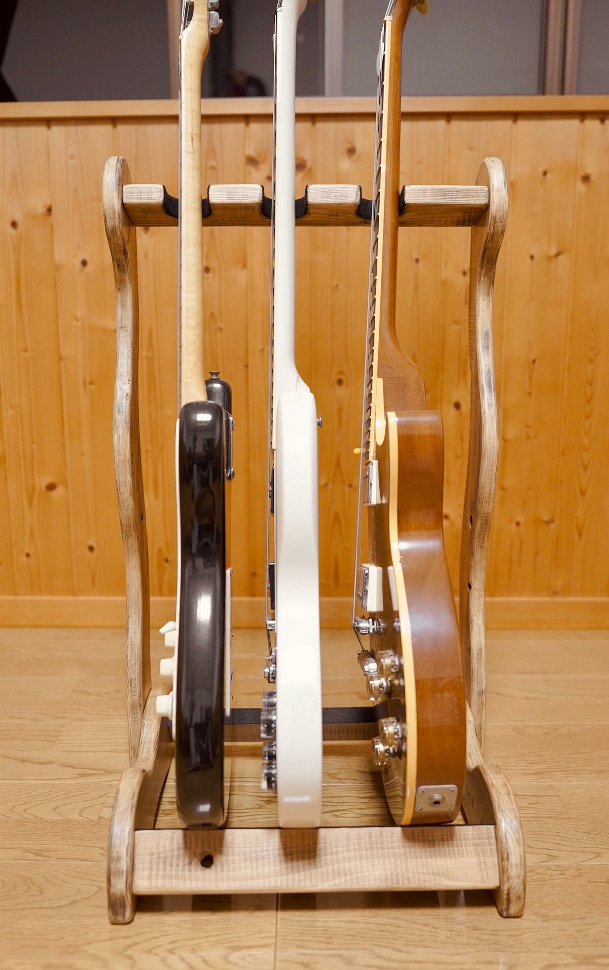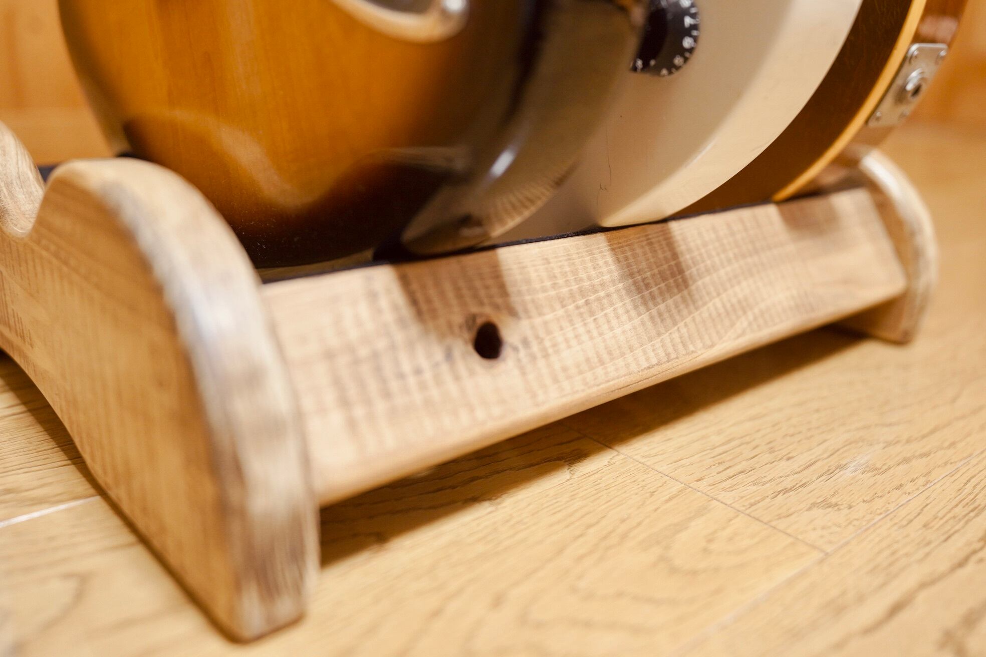 ギターのボディを支える二本の横木は角度をつけてハの字にしてあり、ボディをしっかりとキャッチできるように設計されています。