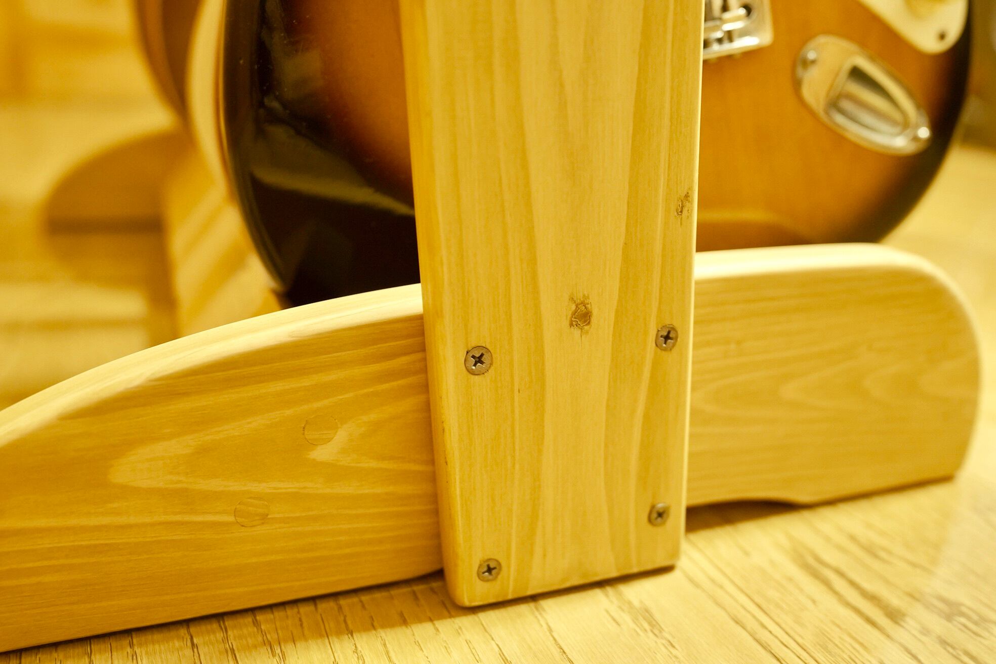 ギターのボディを支える二本の横木は角度をつけてハの字にしてあり、ボディをしっかりとキャッチできるように設計されています。