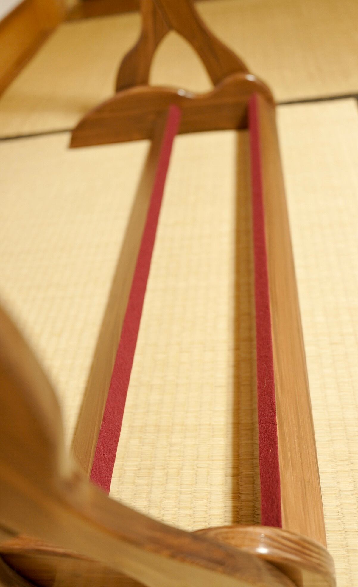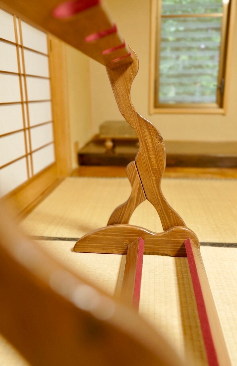 こちらは無垢材を使用したハンドメイドの三味線ラックです。