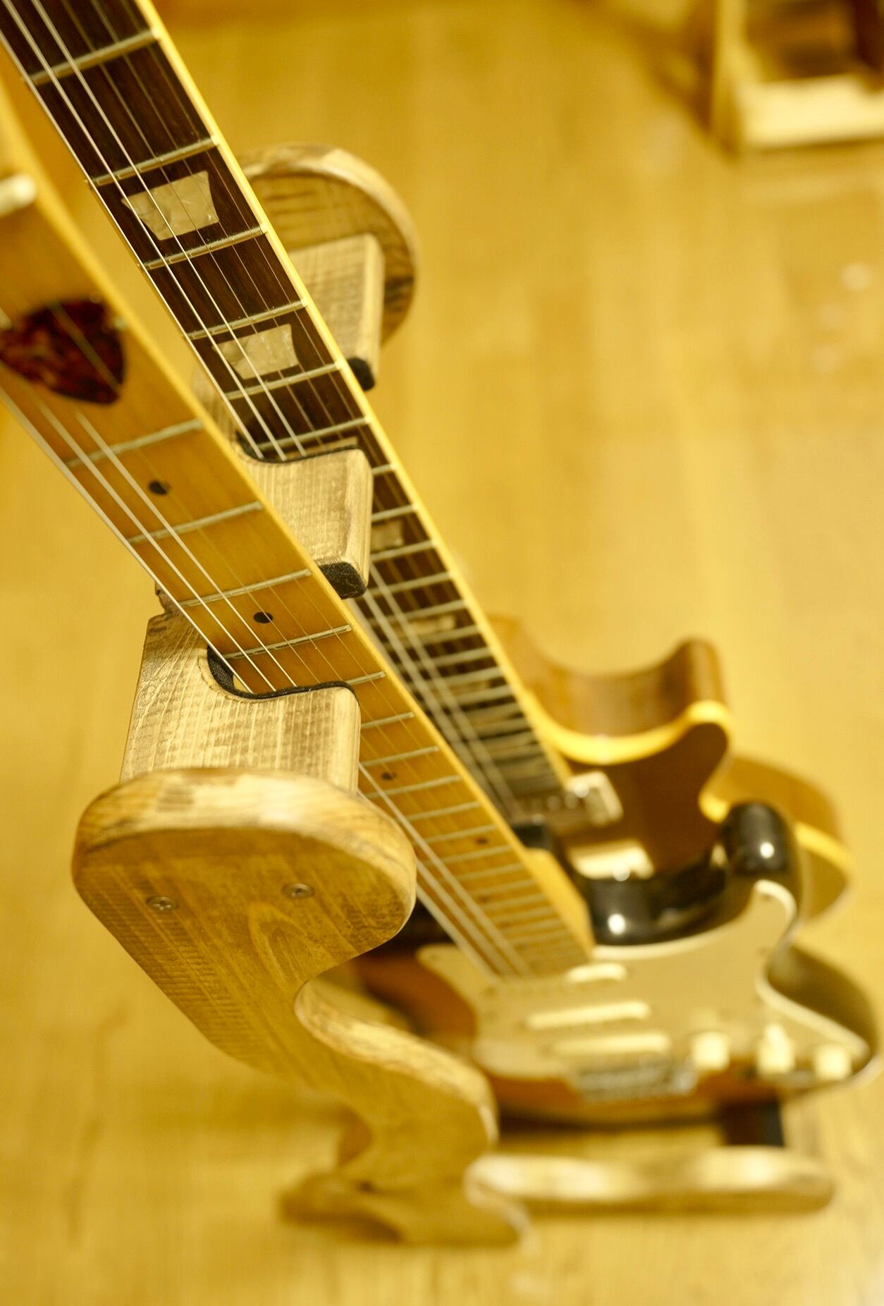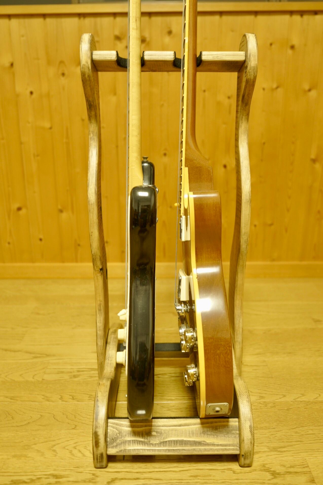 ギターのボディを支える二本の横木は角度をつけてハの字にしてあり、ボディをしっかりとキャッチできるように設計されています。