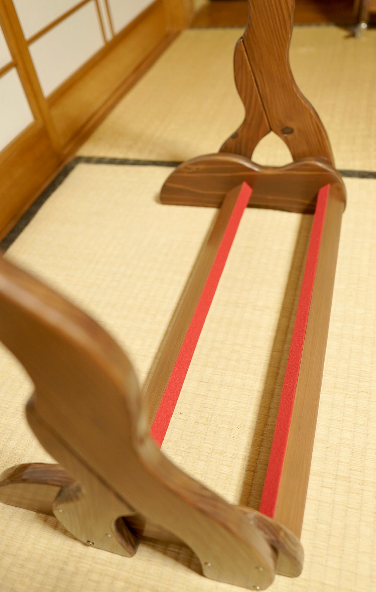こちらは無垢材を使用したハンドメイドの三線ラックです。