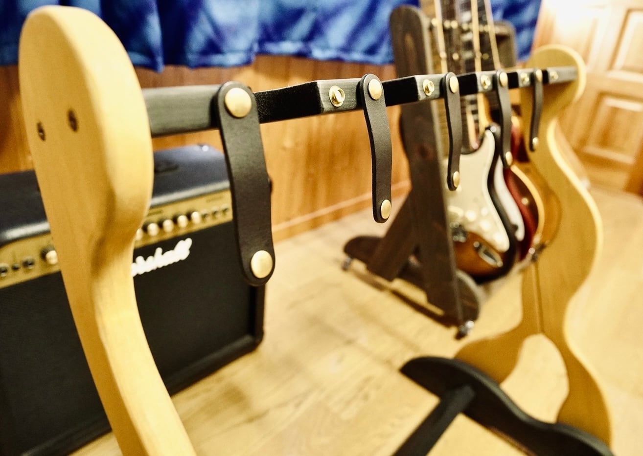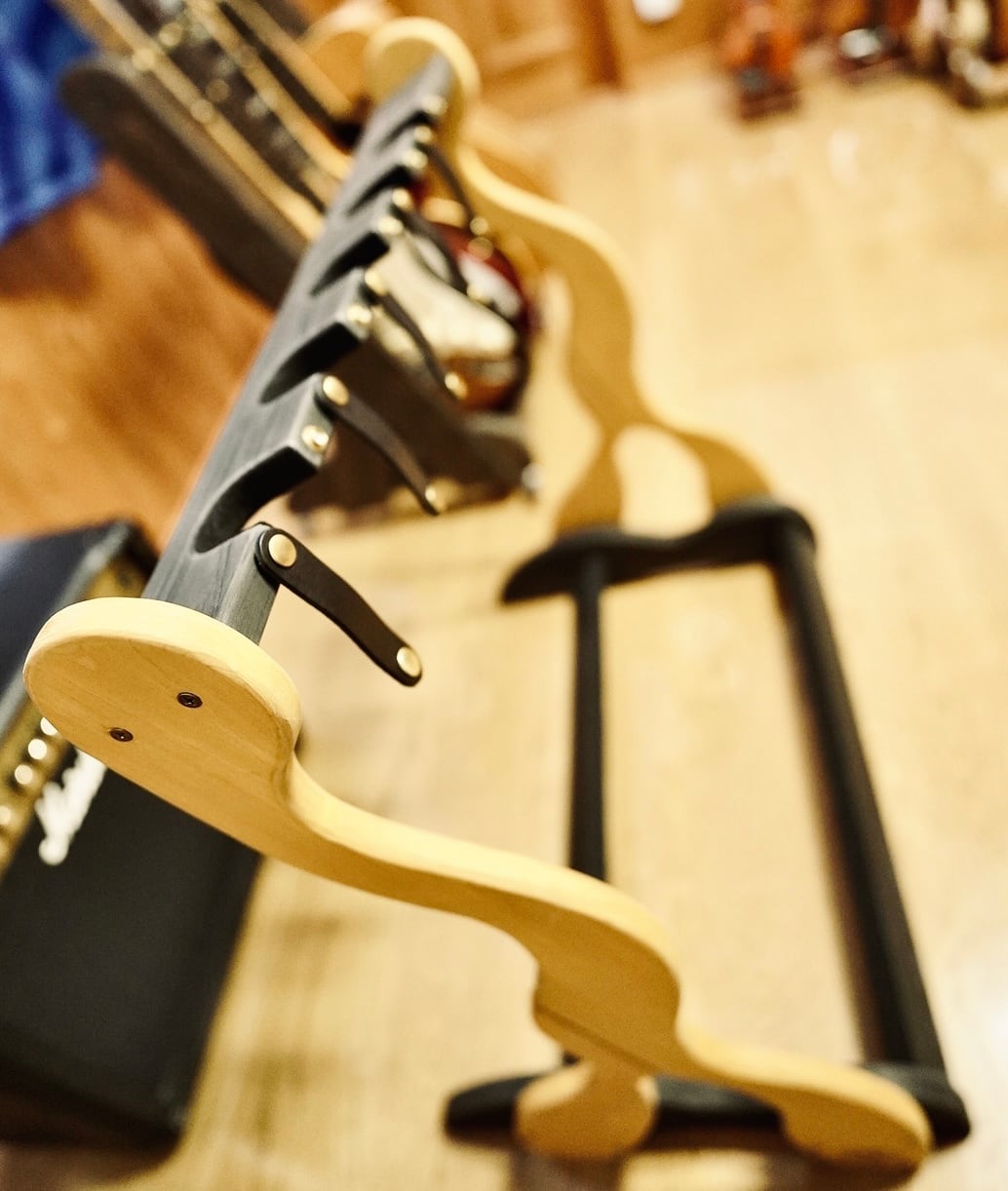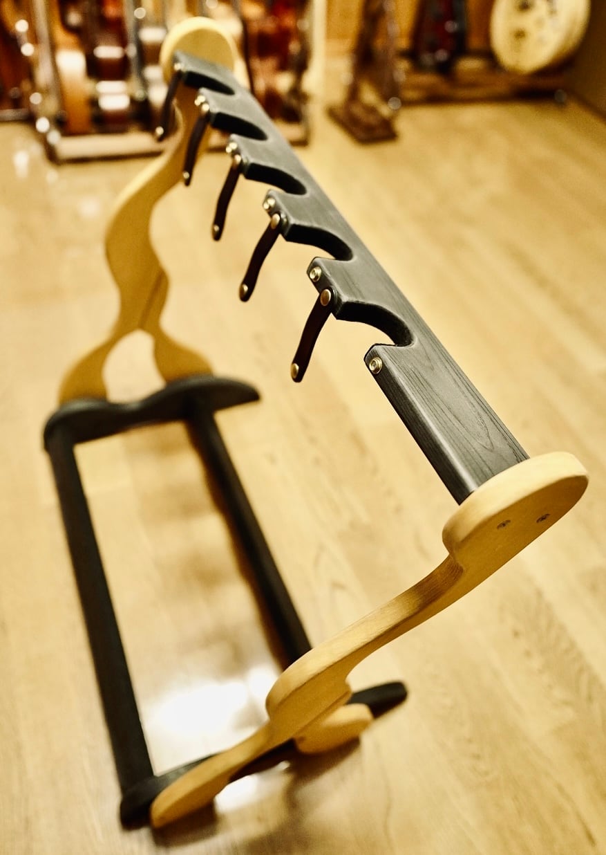 【限定1台】本革ベルトが愛機を守る「極上ハンドメイド」木製ギタースタンド(5本掛け/ステイン)