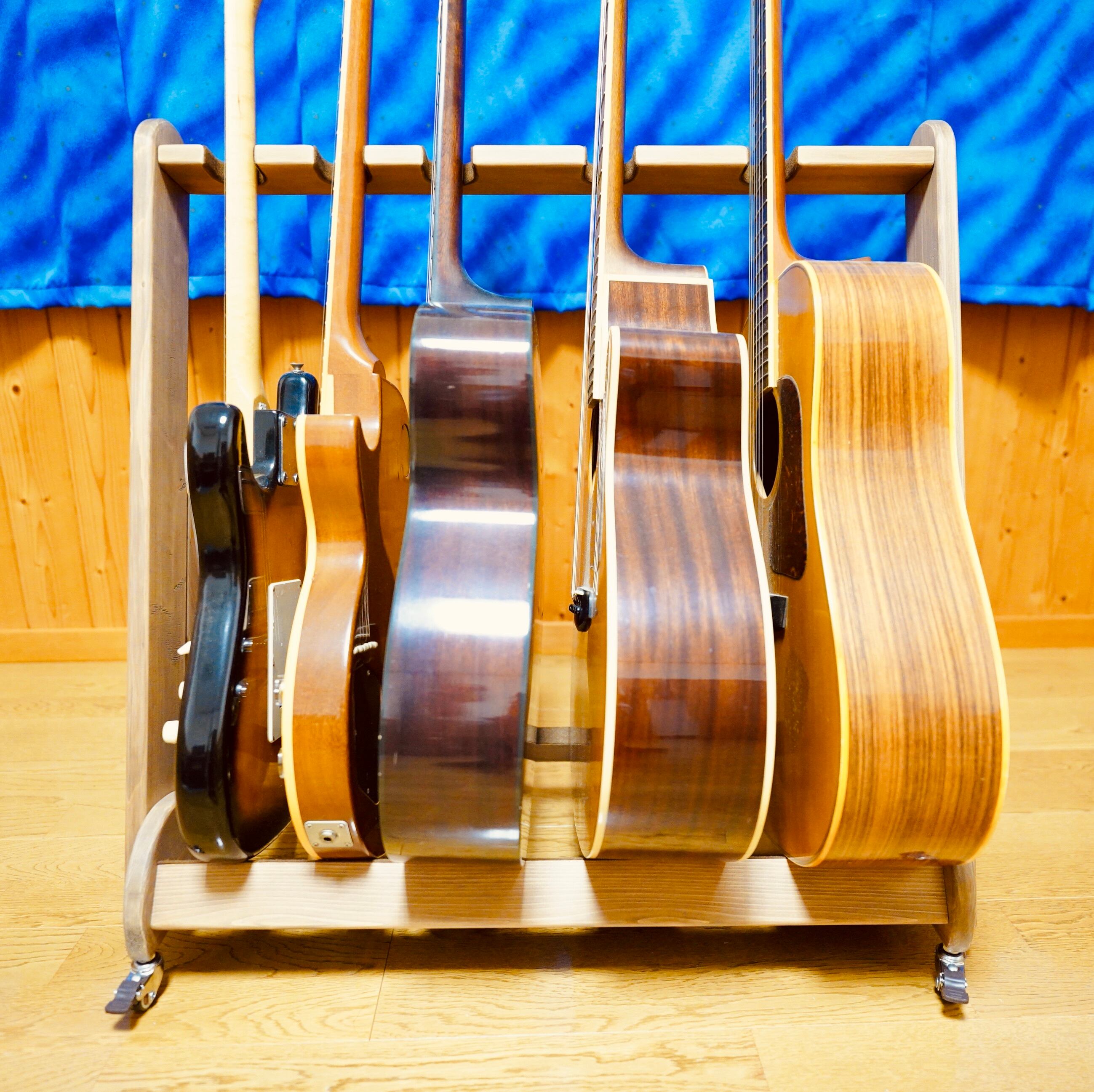【24時間以内に発送】手作り木工 木製ギタースタンド (保護剤仕上げ) 5本掛け キャスター付き