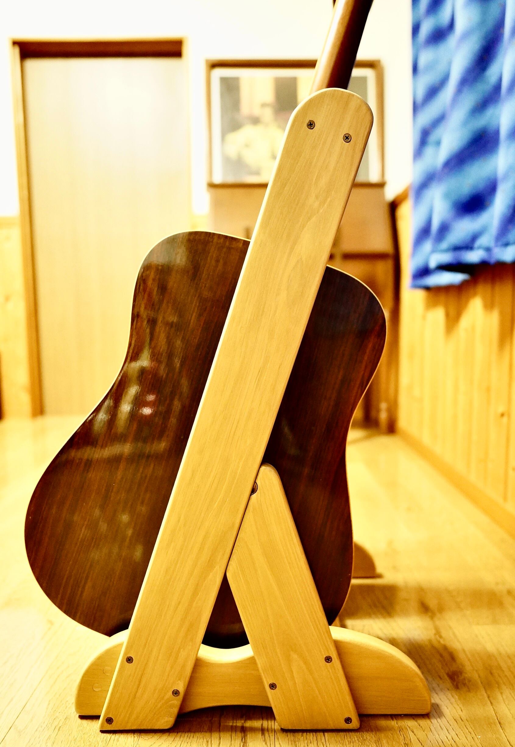 ギターのボディを支える二本の横木は角度をつけてハの字にしてあり、ボディをしっかりとキャッチできるように設計されています。