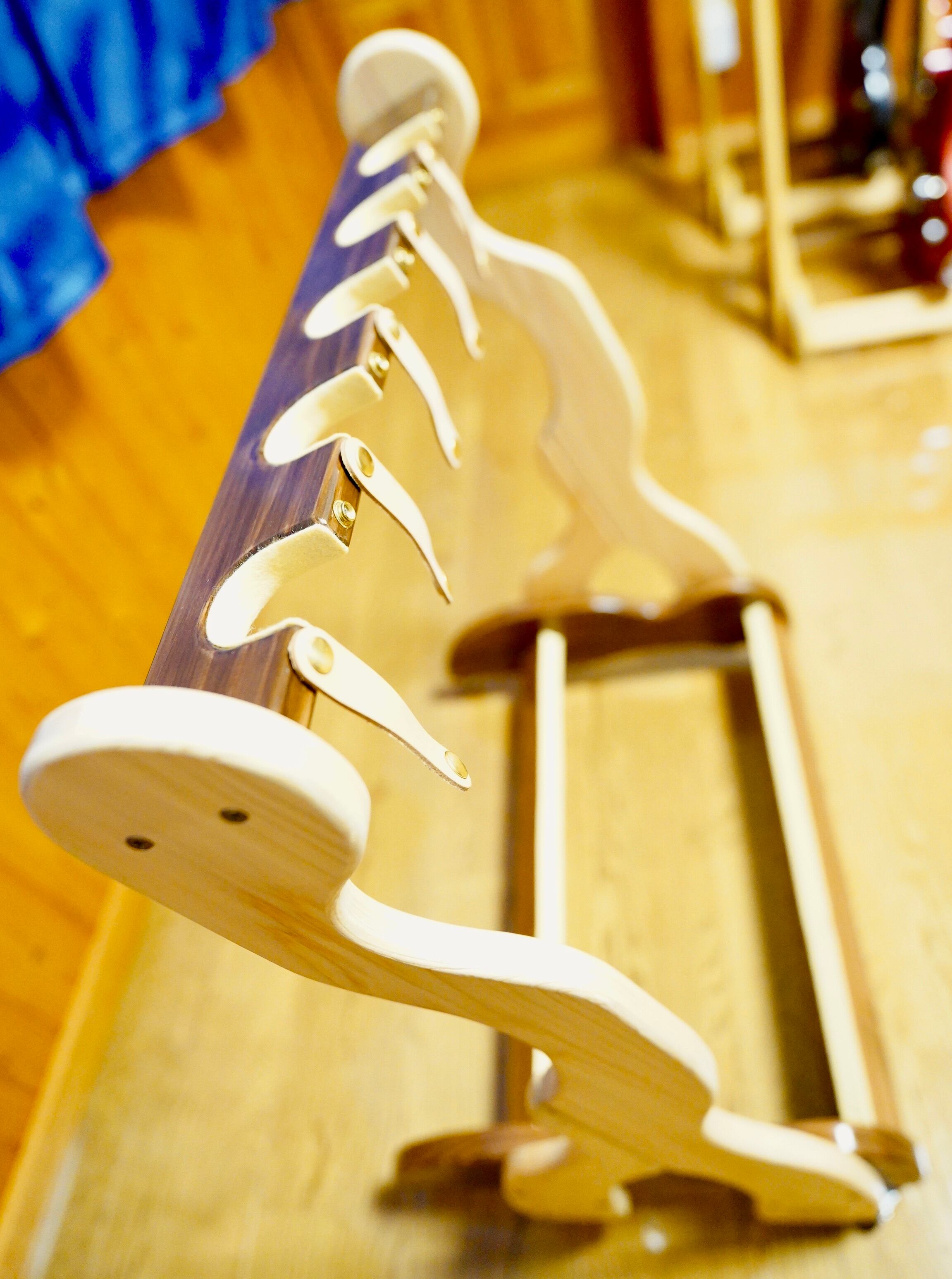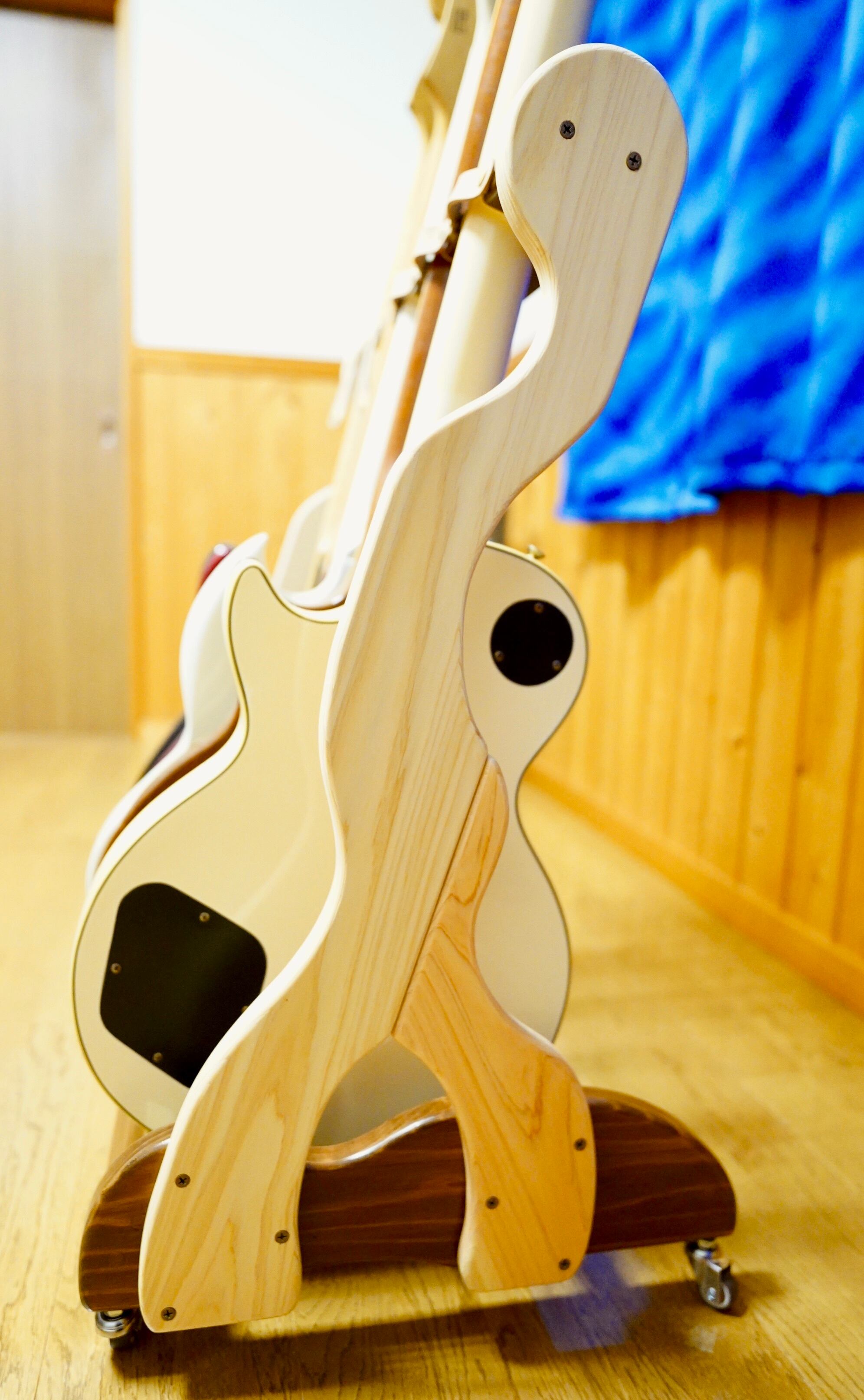 ギターのボディを支える二本の横木は角度をつけてハの字にしてあり、ボディをしっかりとキャッチできるように設計されています。