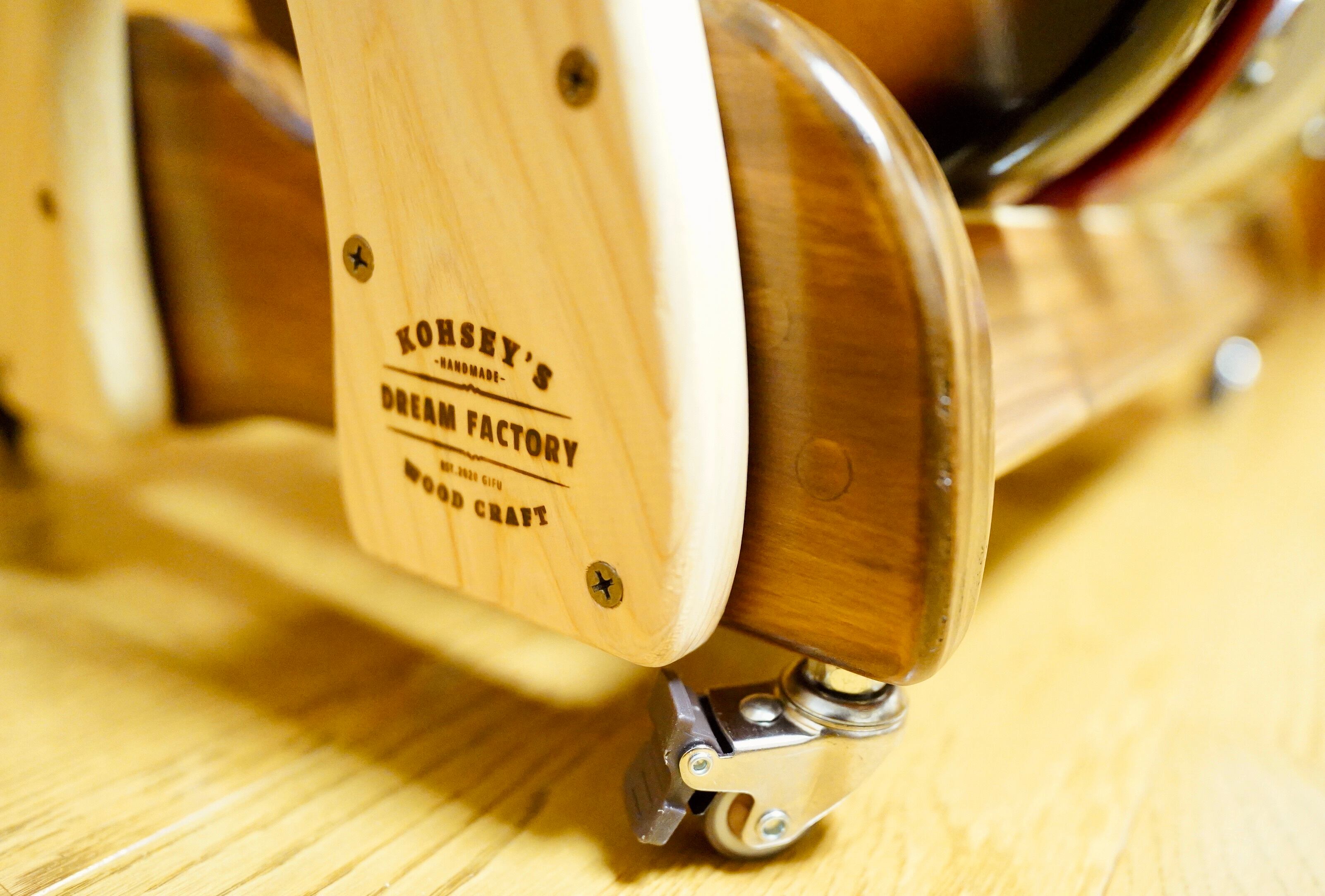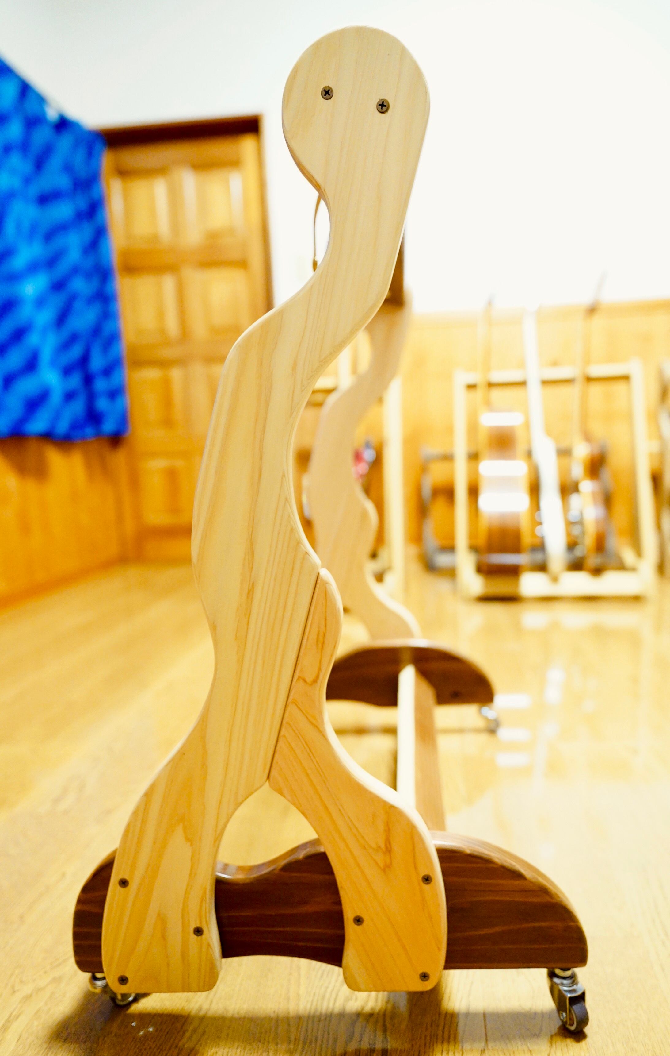 【24時間以内に発送】手作り木工 ギタースタンド (ニス仕上げ)キャスター & 転倒防止ベルト付き