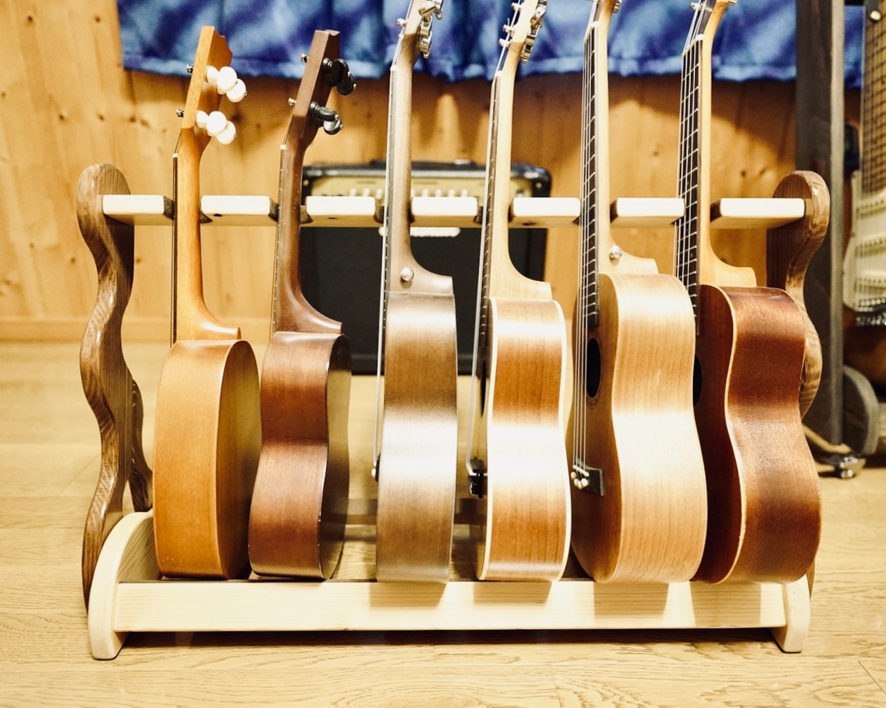 【限定1台】世界に一つの曲線美。ハンドメイド木製ウクレレスタンド(6本掛け・ニス仕上げ)