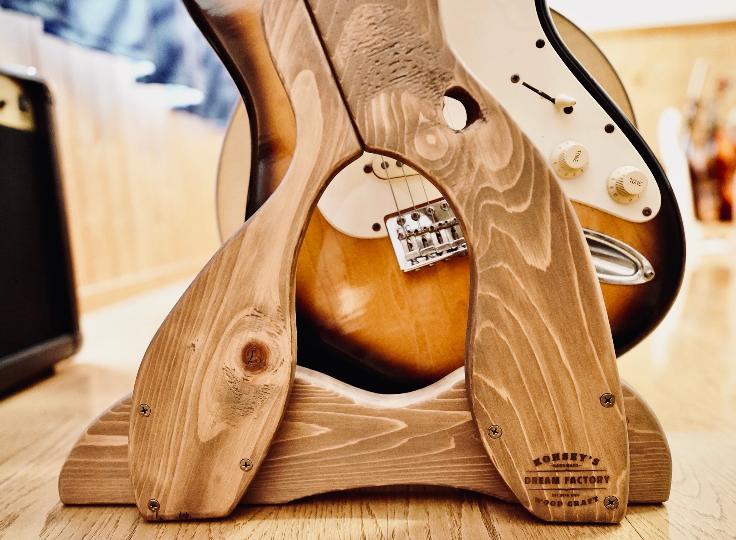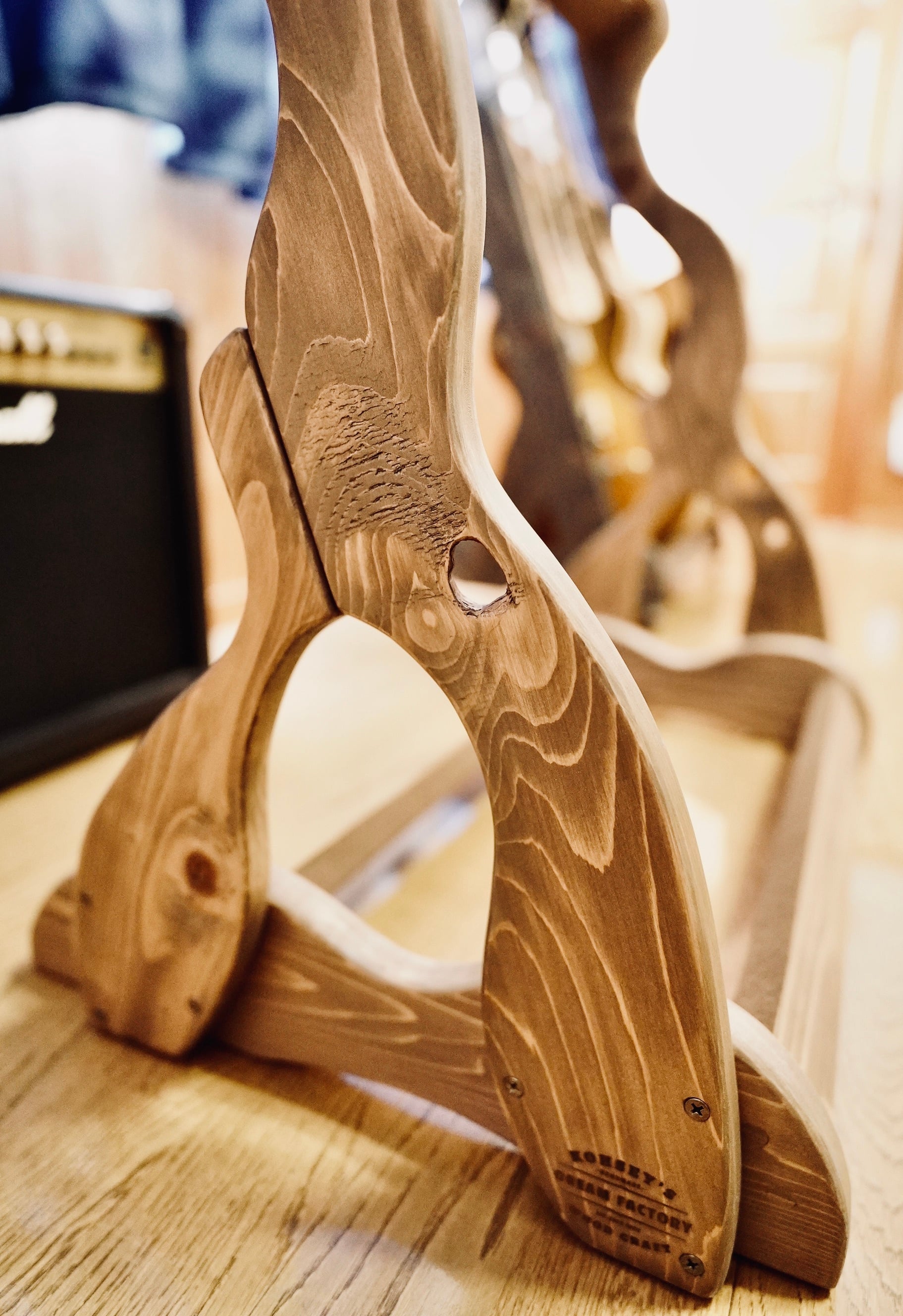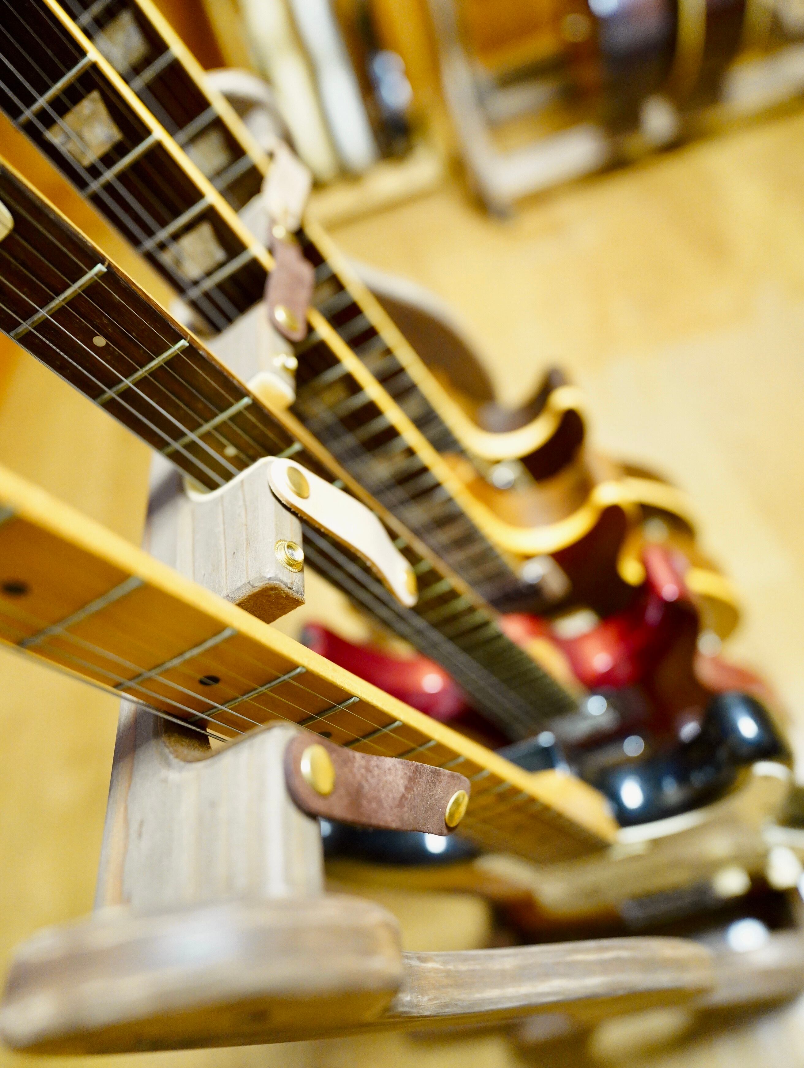 ギターを支える二本の横木は角度をつけてハの字にしてあり、ボディをしっかりとキャッチされるように設計しました。
