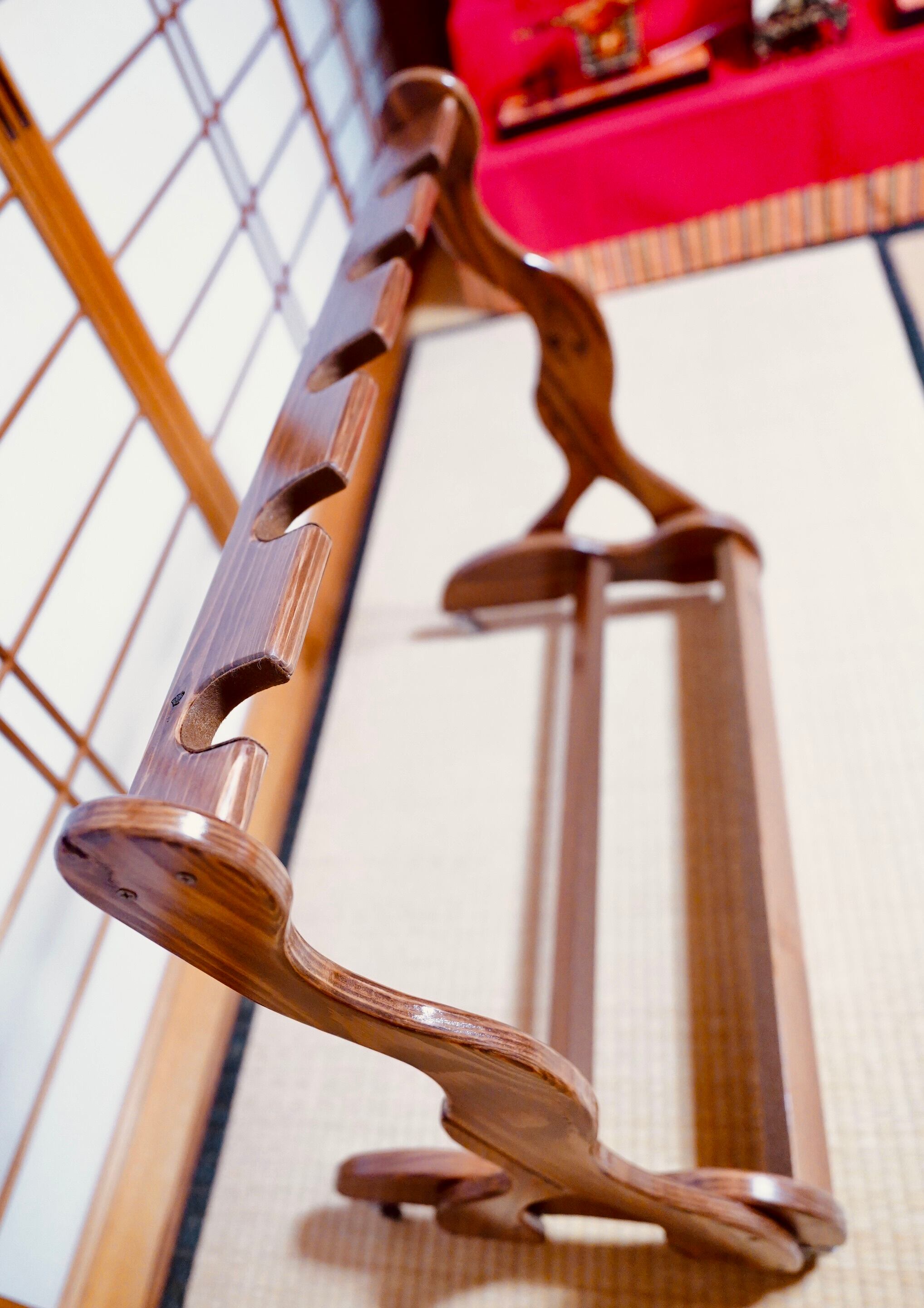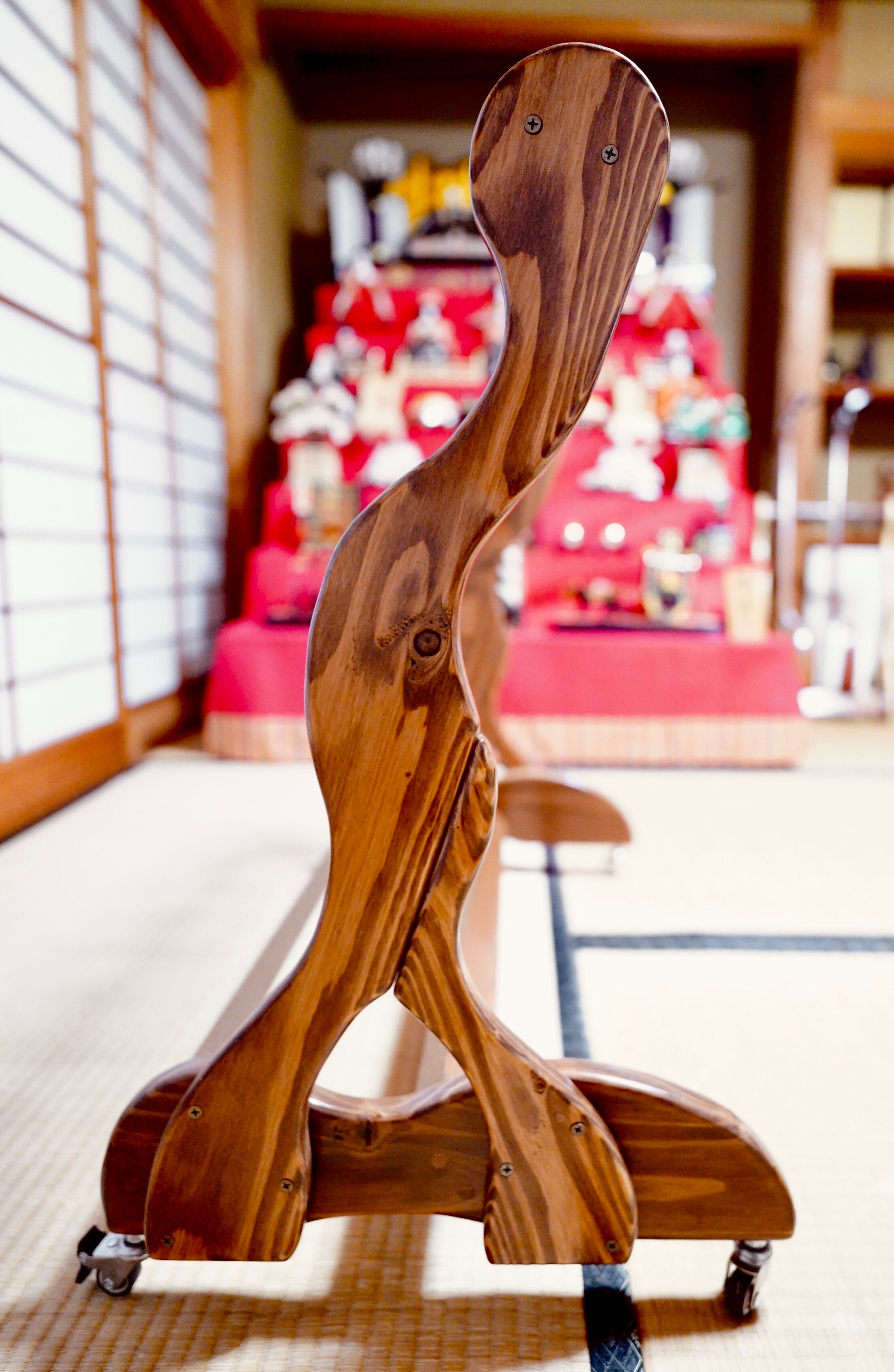 こちらは無垢材を使用したハンドメイドの三味線ラックです。