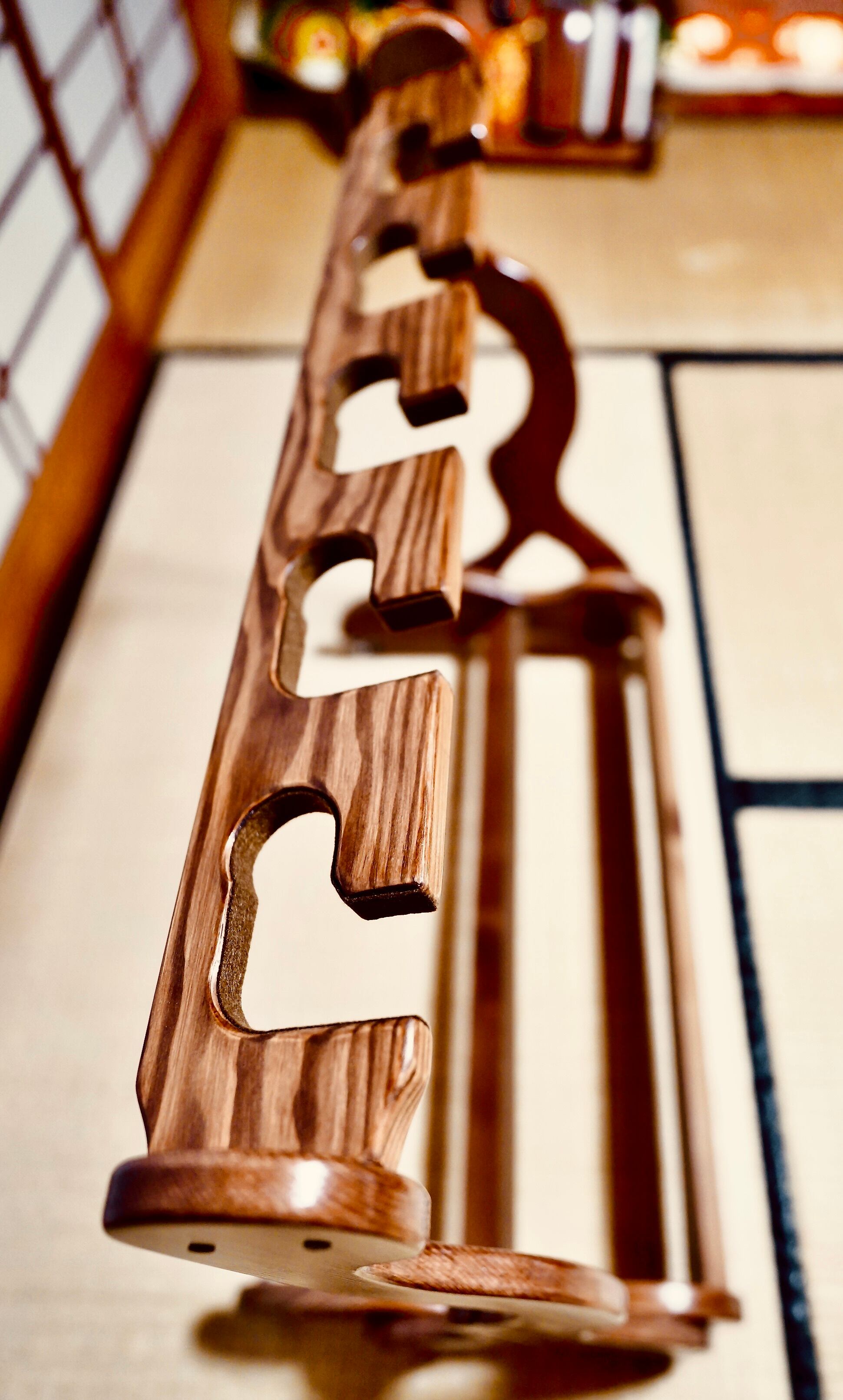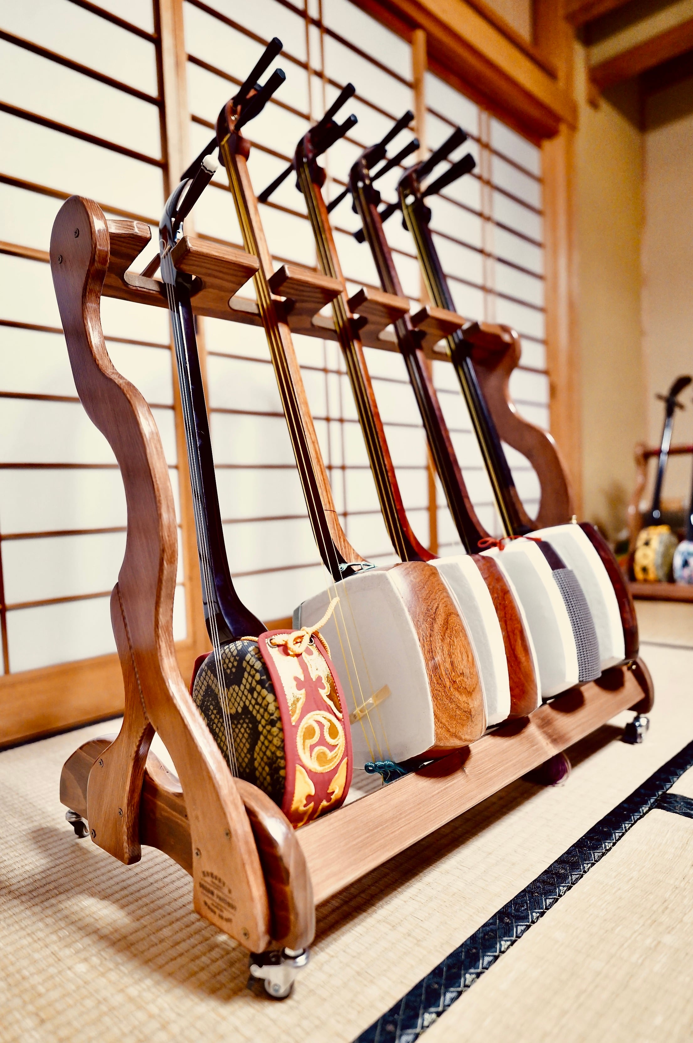 こちらは無垢材を使用したハンドメイドの三味線ラックです。
