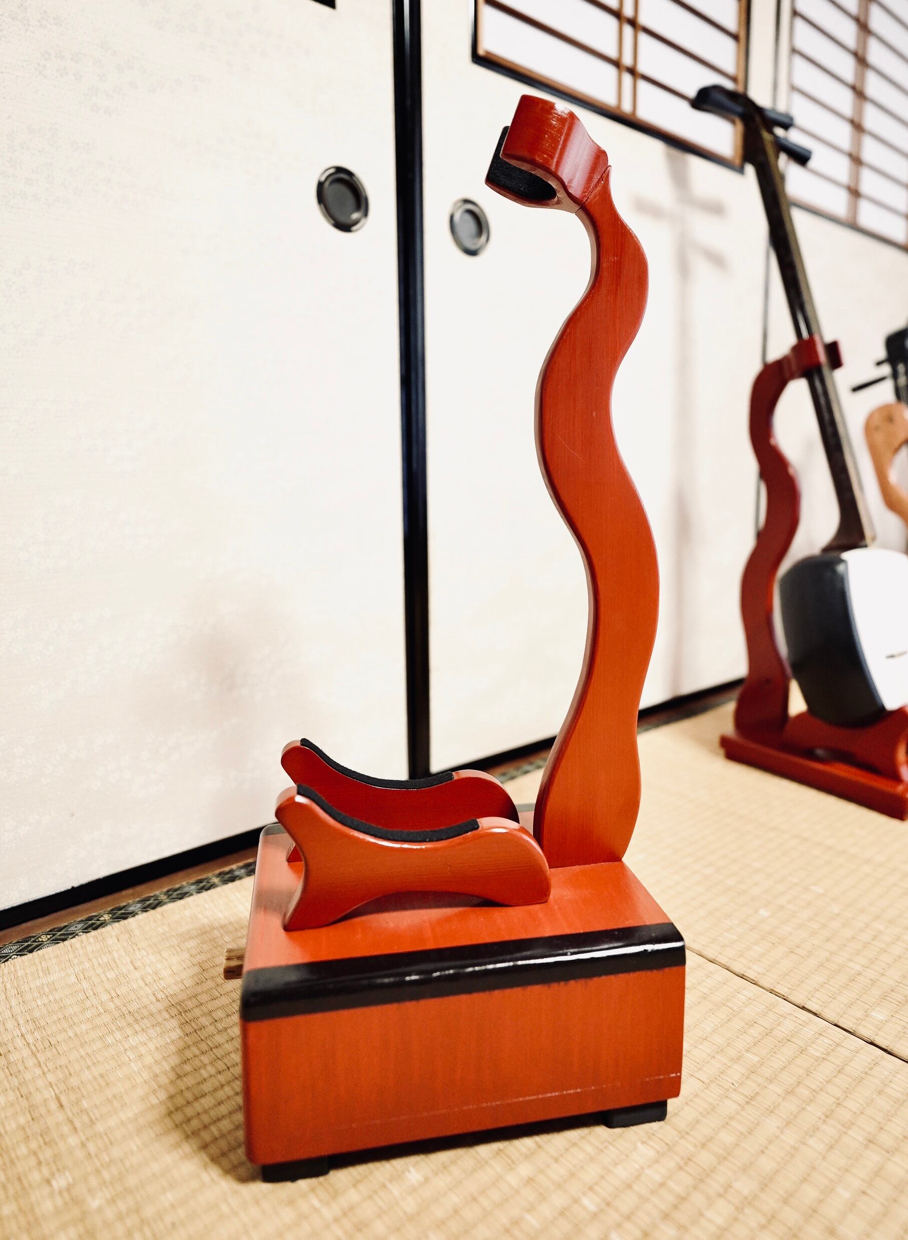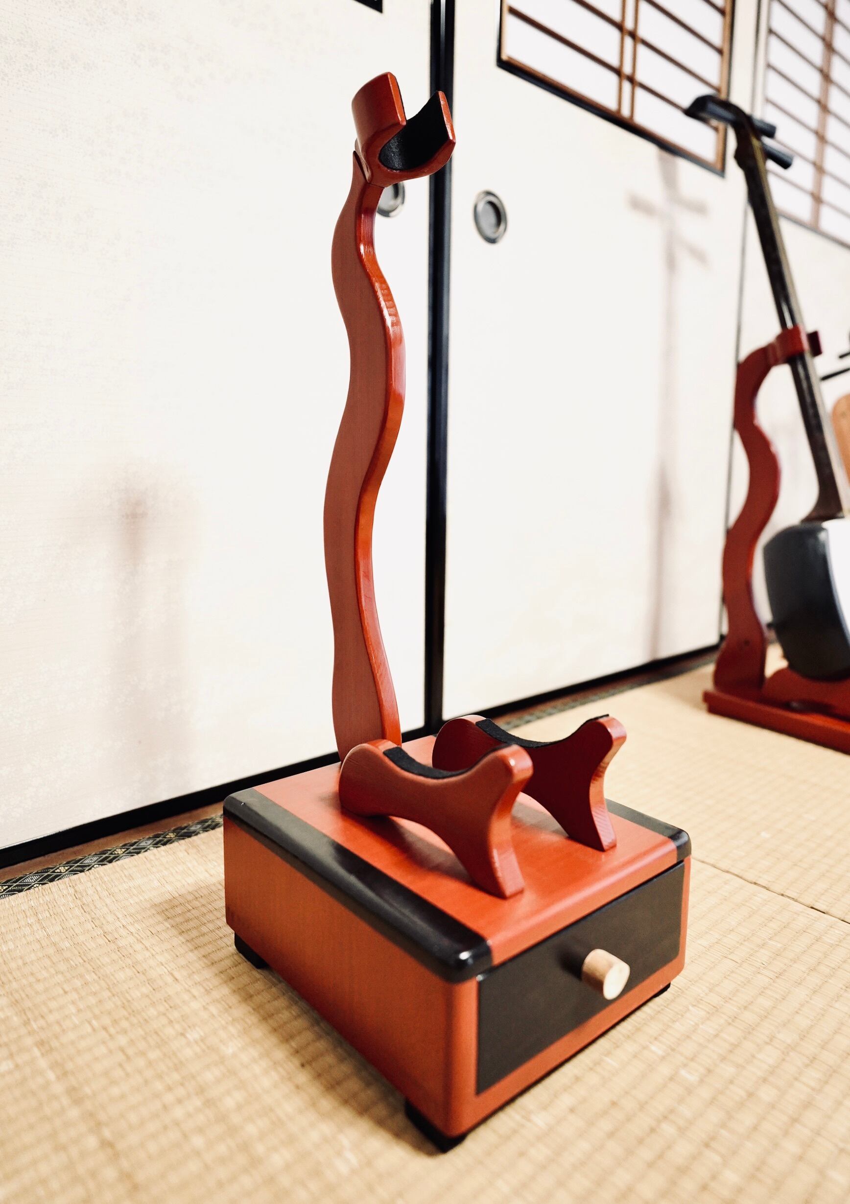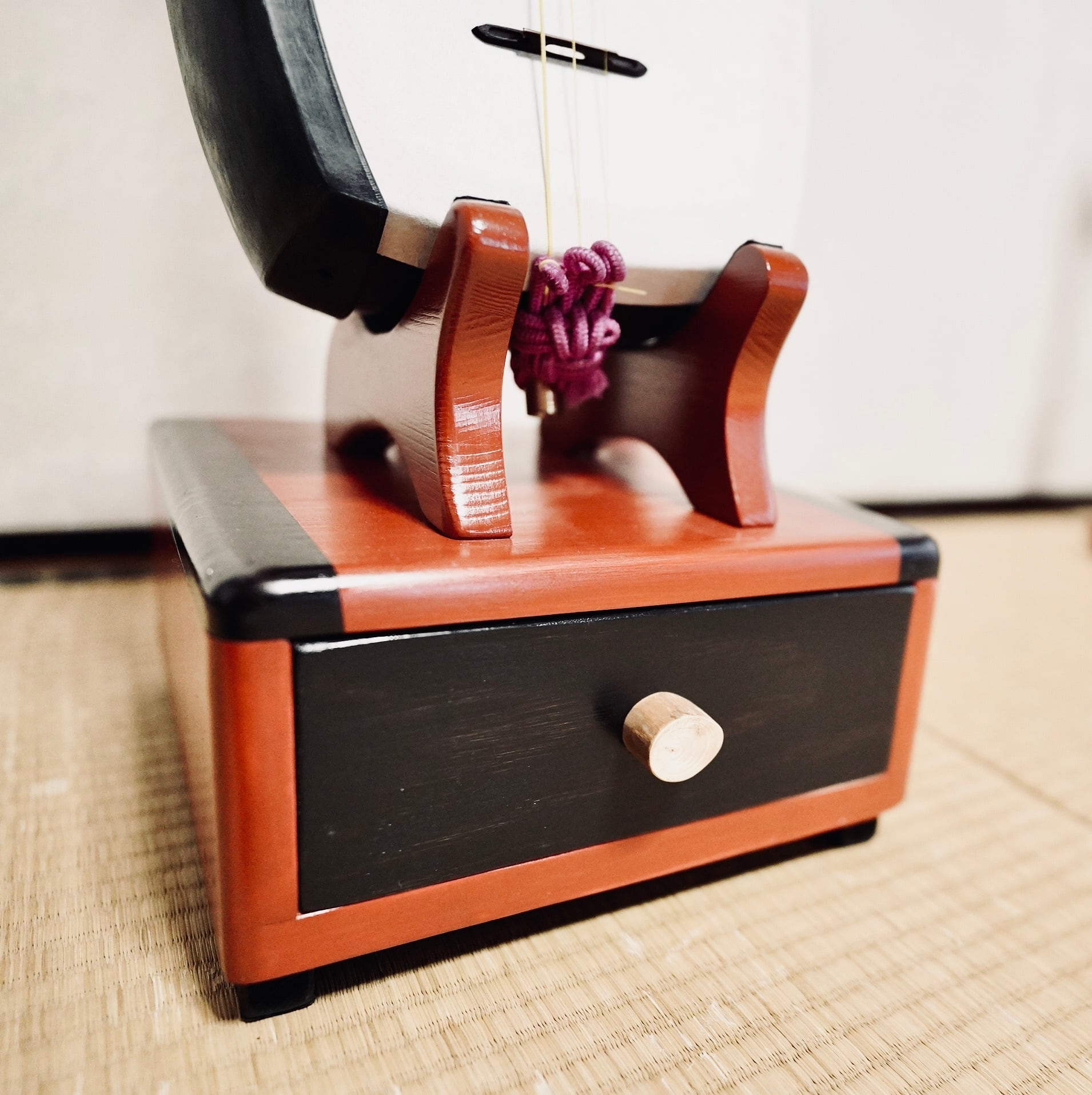 【再販不可】手作り木工 木製三味線スタンド (漆仕上げ) 1本掛け 引き出し付き