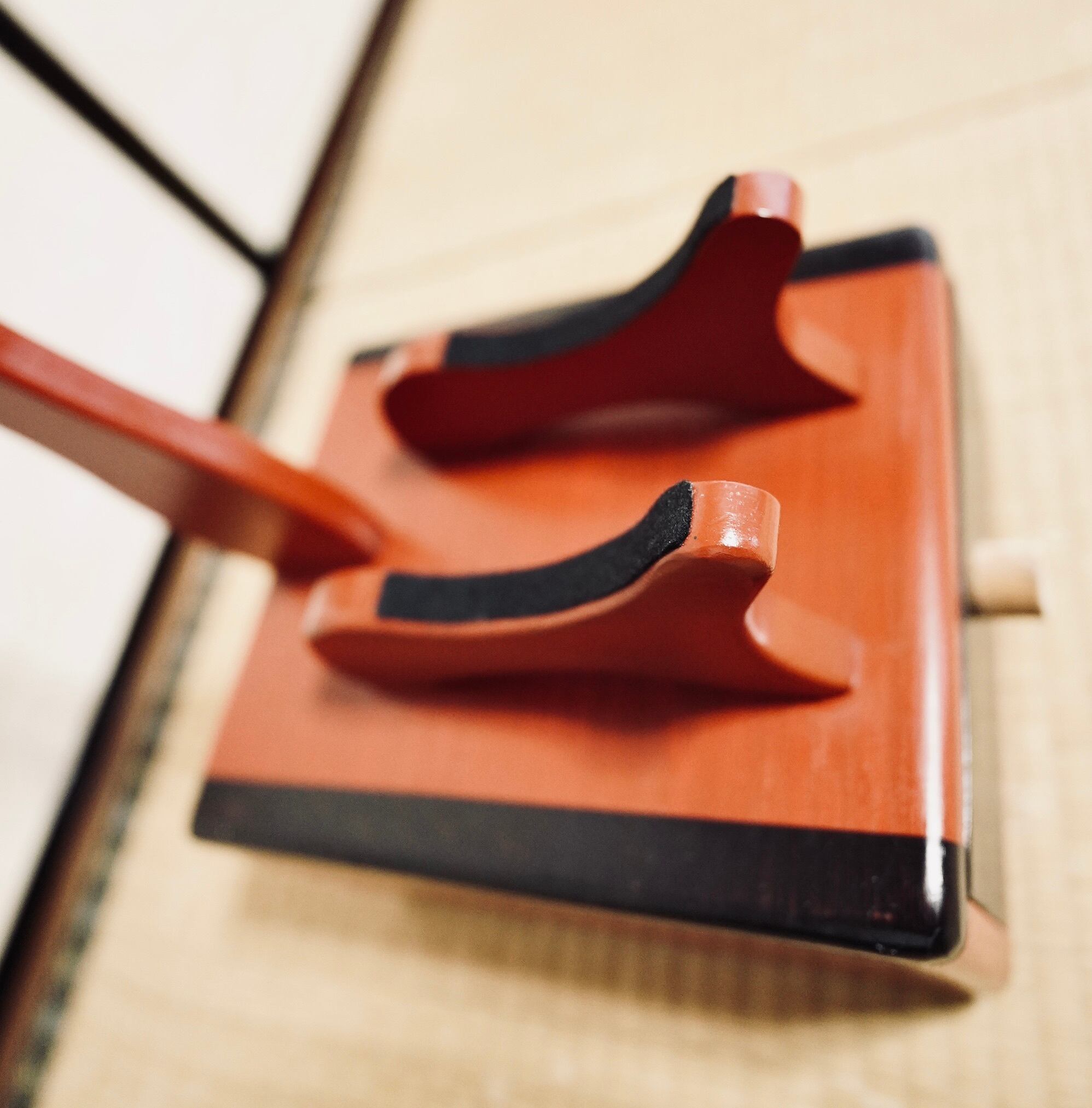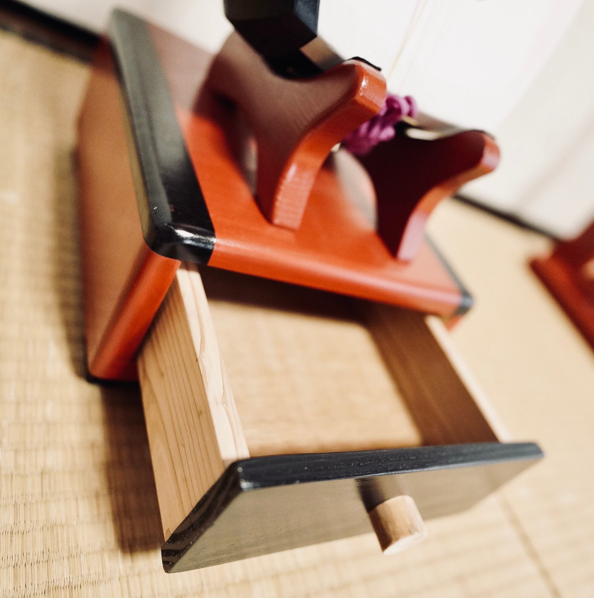 全体的に鎌倉赤色(少し暗めの赤色)の工芸うるしで、サイドのラインと引き出しの前板は黒色の工芸うるしで仕上げました。