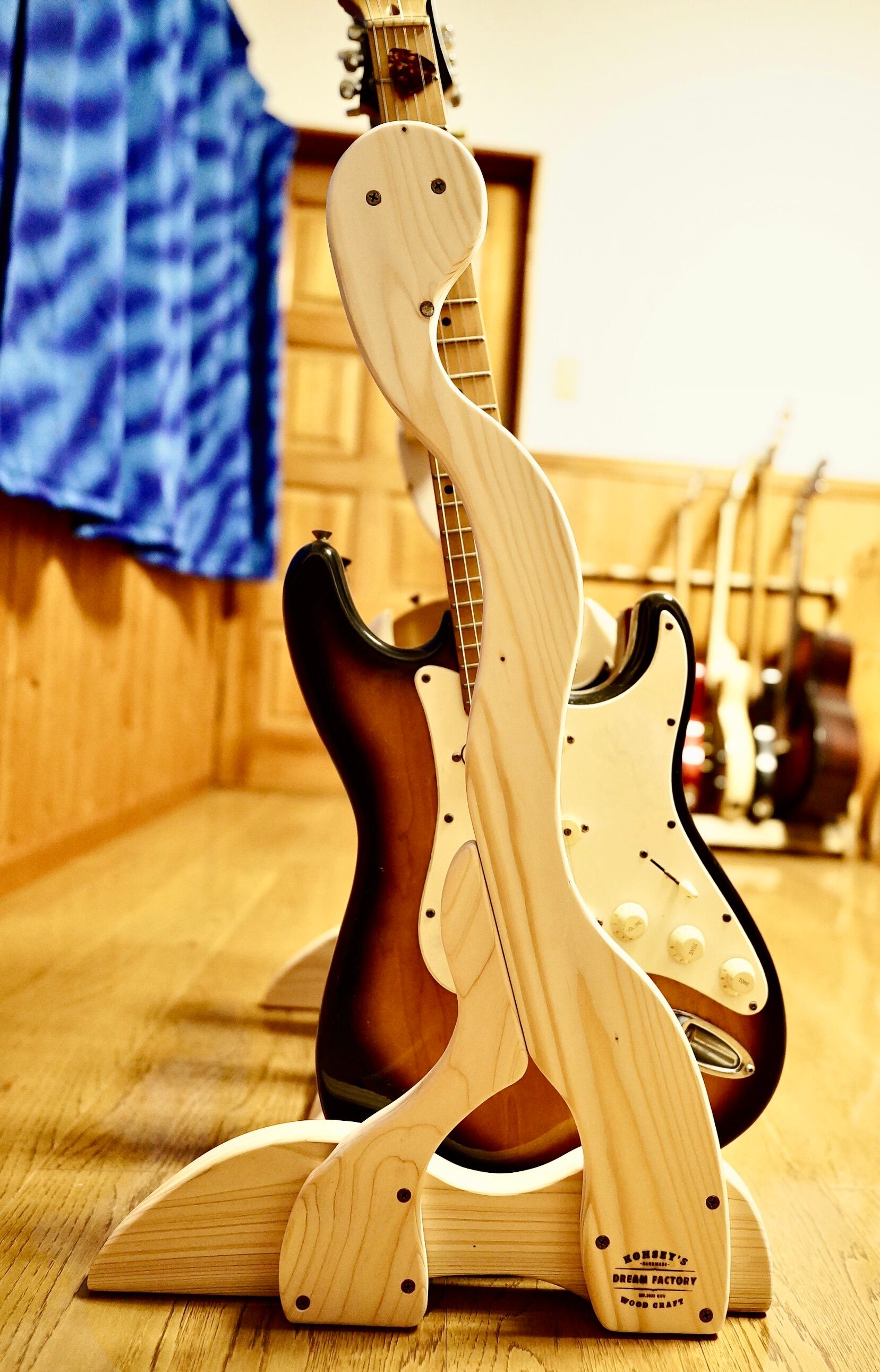 ギターのボディを支える二本の横木は角度をつけてハの字にしてあり、ボディをしっかりとキャッチできるように設計されています。