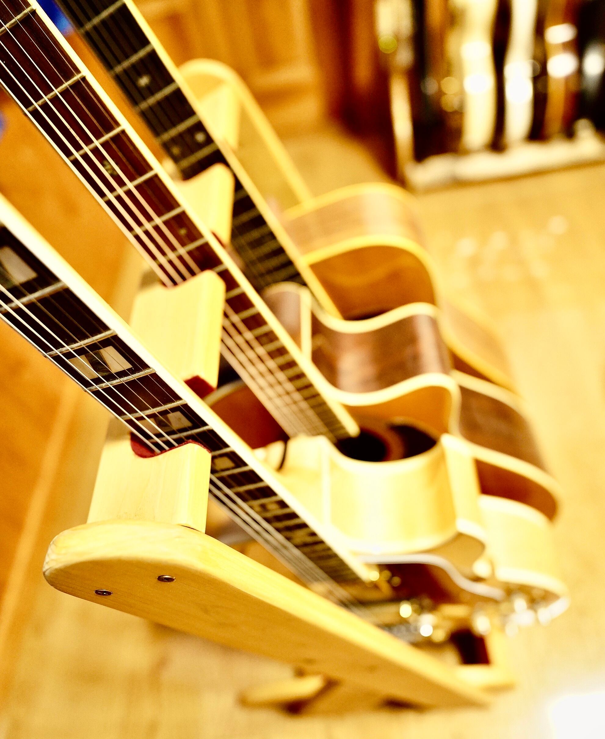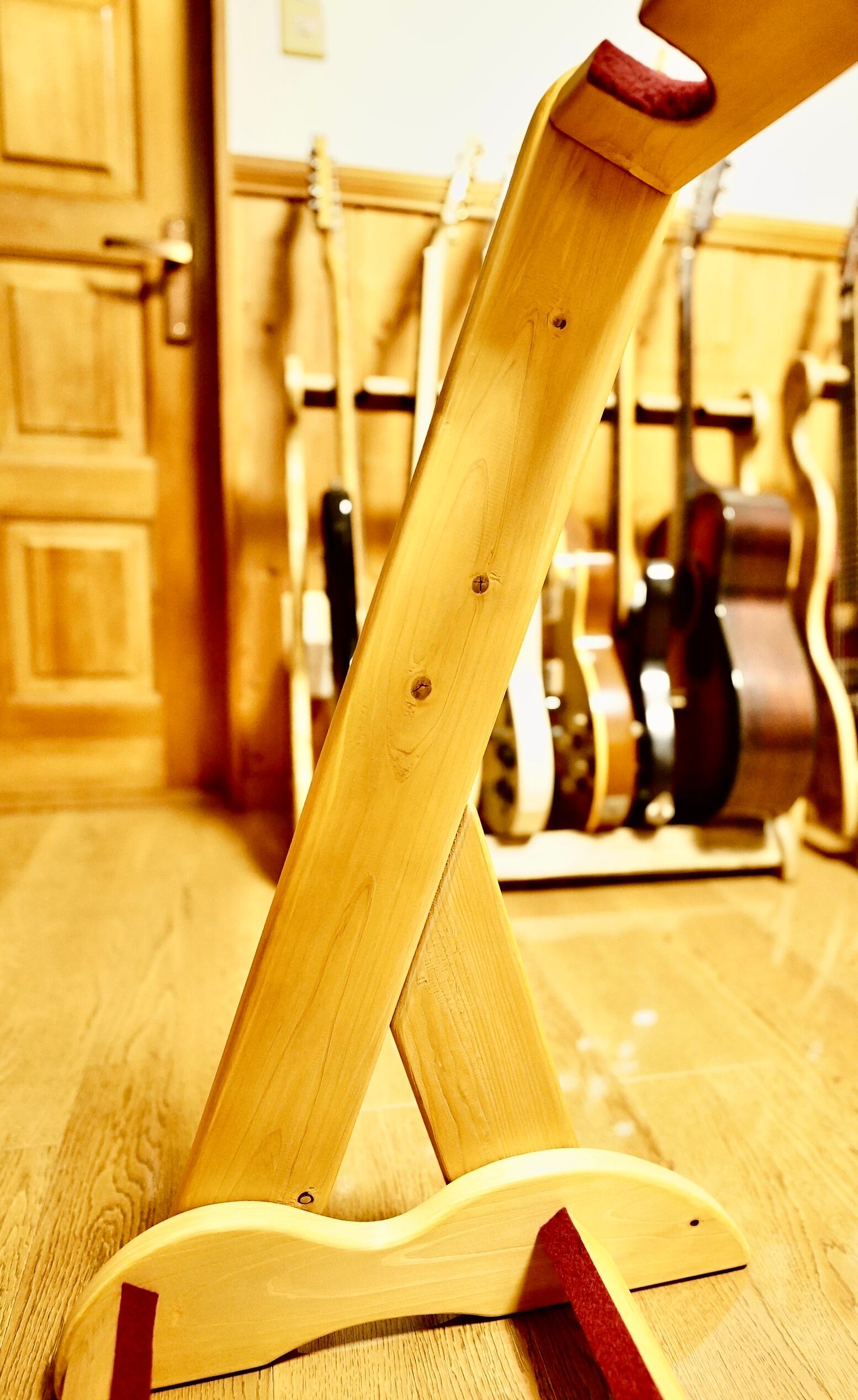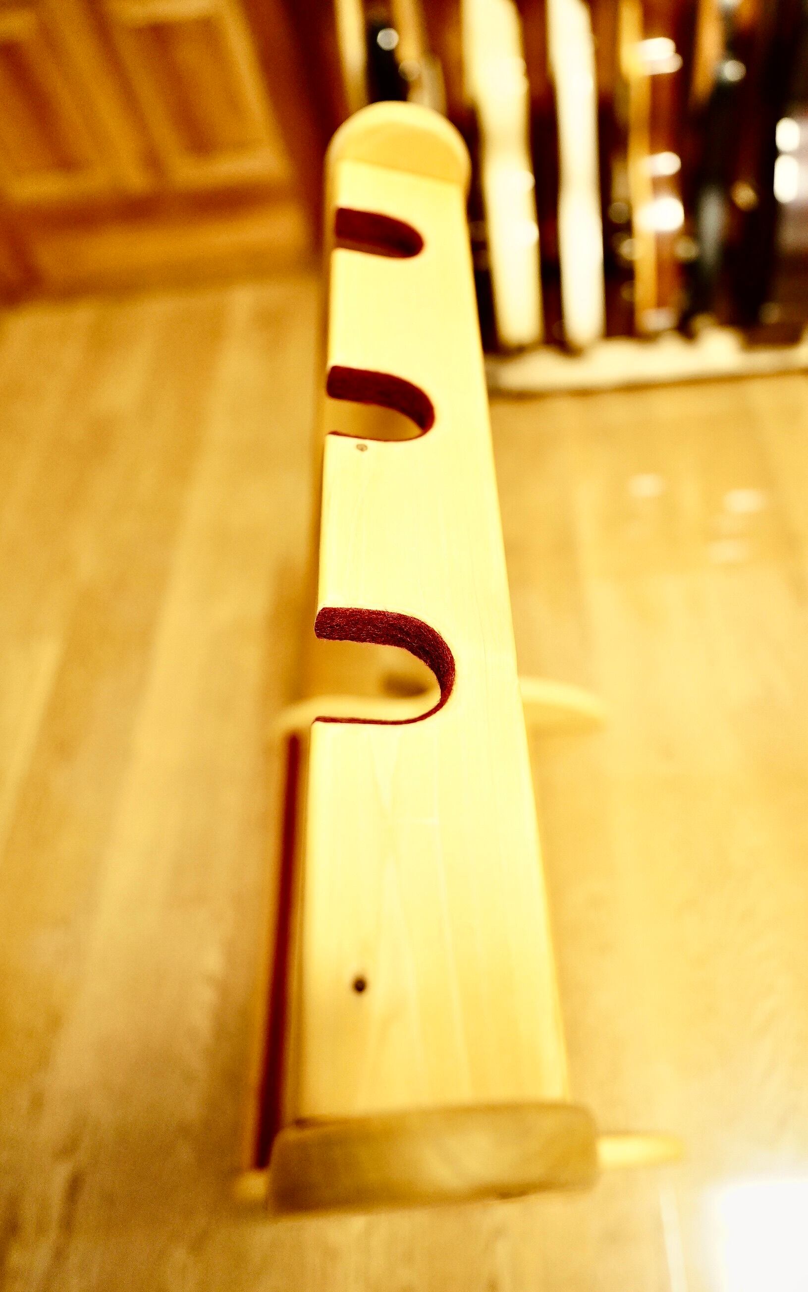 ギターのボディを支える二本の横木は角度をつけてハの字にしてあり、ボディをしっかりとキャッチできるように設計されています。