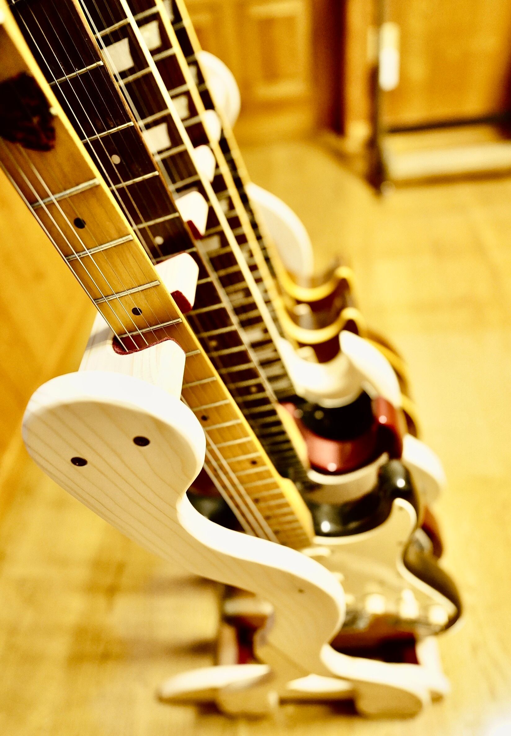 こちらは無垢材を使用した5本掛けのハンドメイドのギターラックです。